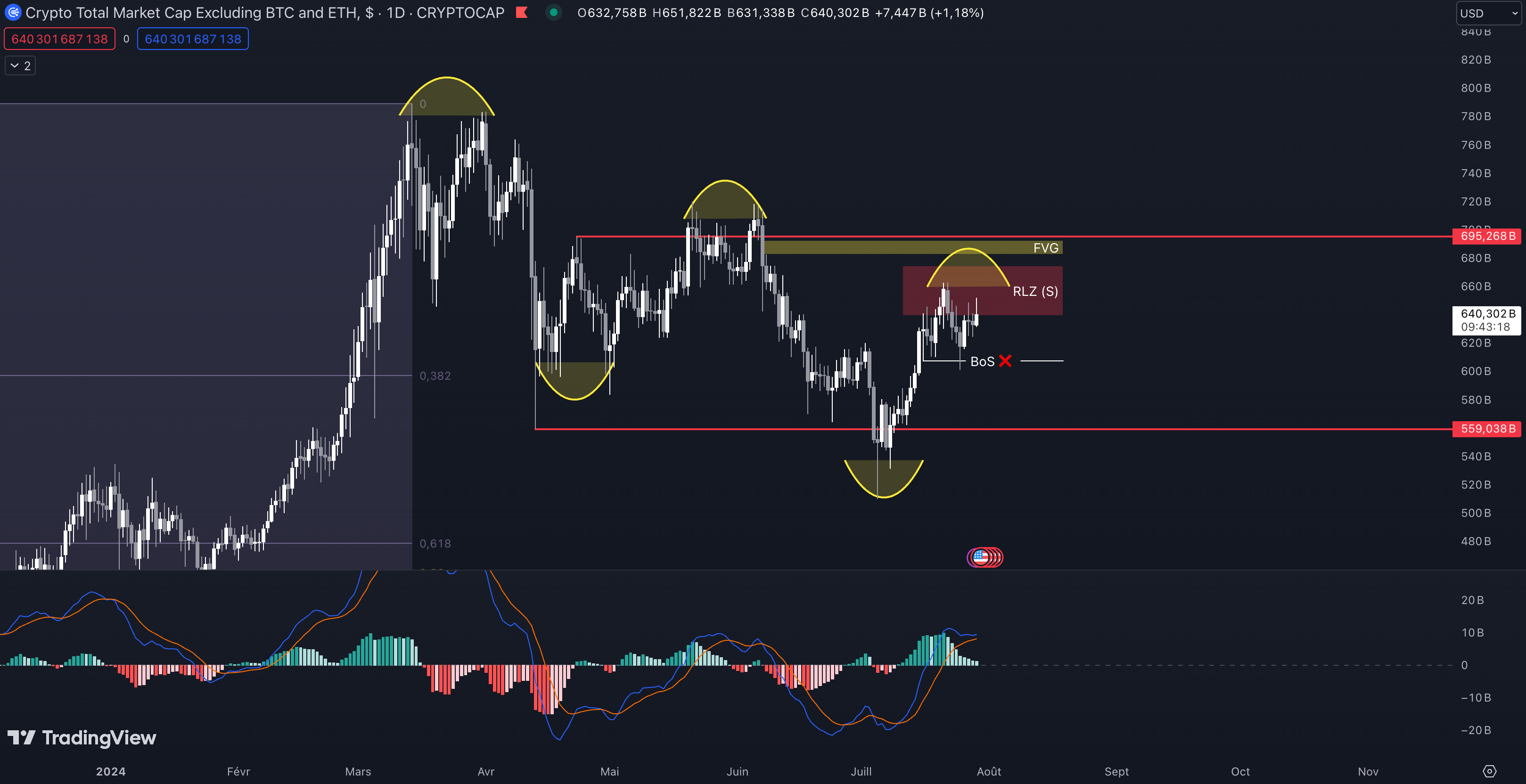 Jusqu’à présent, le sommet descendant dans la RLZ short n’est pas encore confirmé, bien que le momentum faiblisse, il sera validé en cas de perte du creux à 607 milliards $.