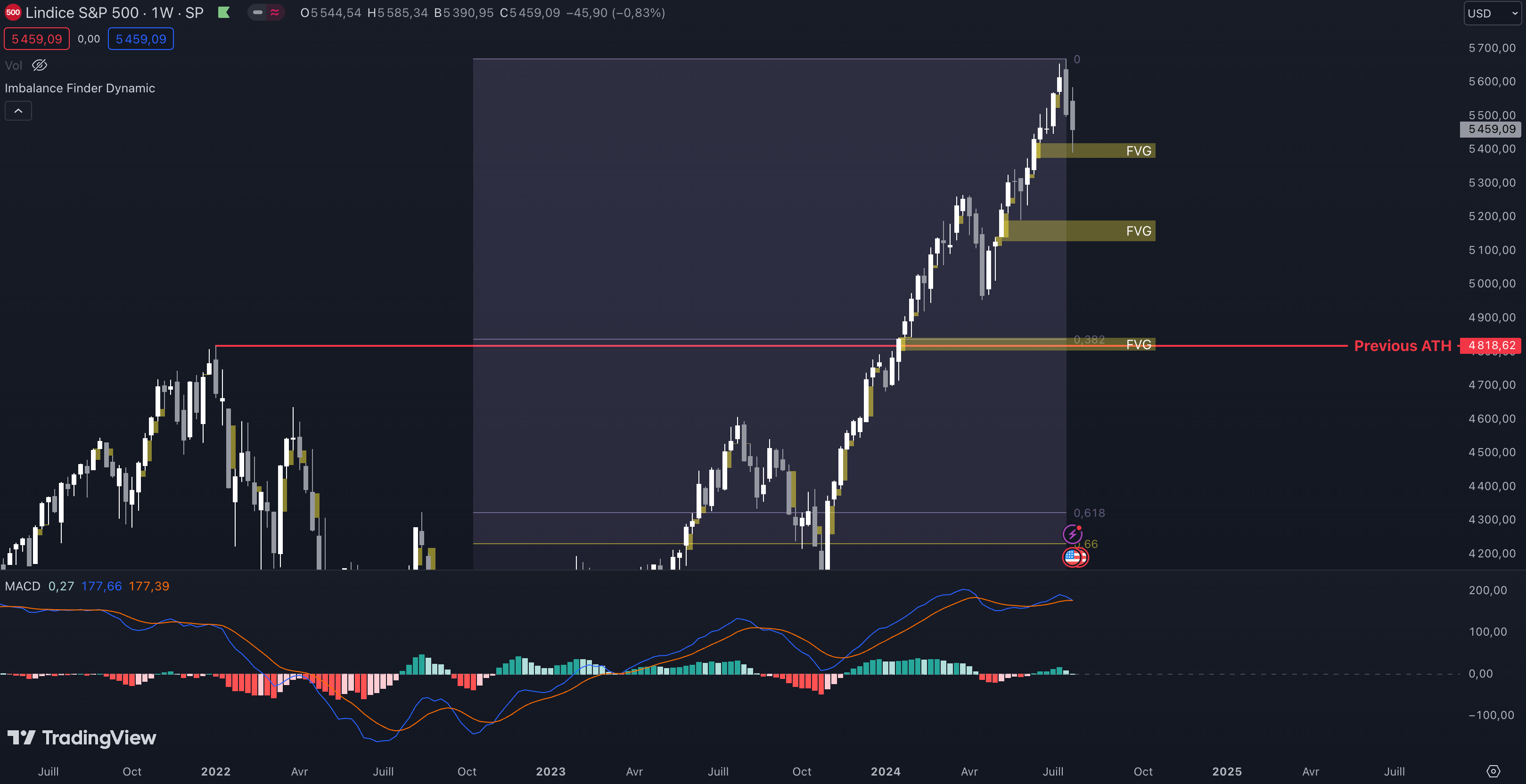 Le price action actuel octroie peu de chance au maintien de la FVG des 5.400 points, la prochaine réside à 5.160 points.