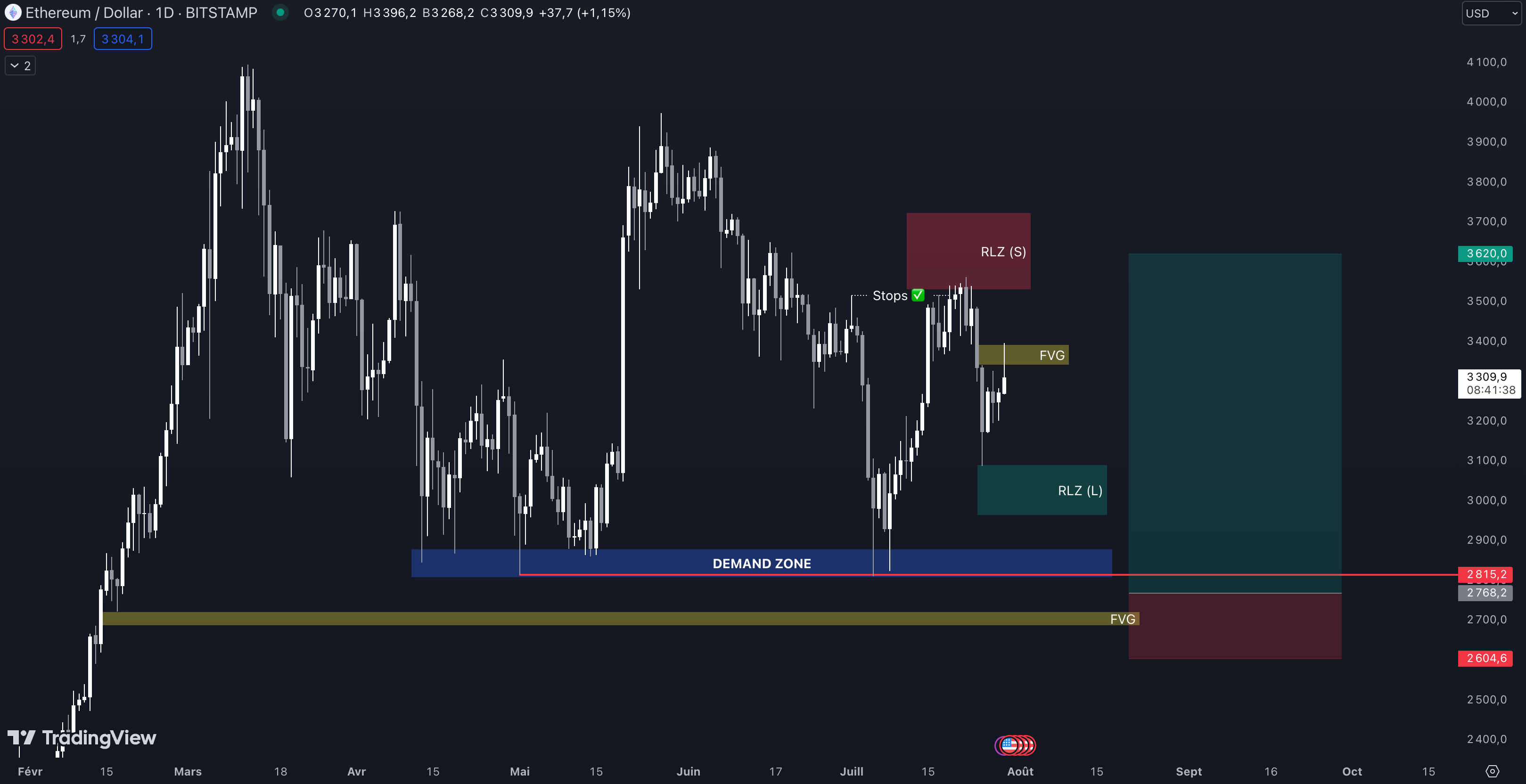 En revanche, si la FVG autour des 3.400 $ était breakée et maintenue, alors le prix devra s’affranchir de la RLZ short pour cibler les liquidités entre 4.000 et 4.100 $.