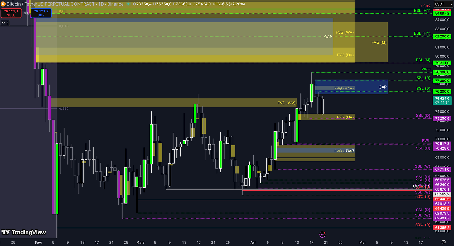Enfin, si toujours aucun top ne se forme dans la zone précédente, alors le prochain objectif sera le niveau à 78.300 $ (target N°3).