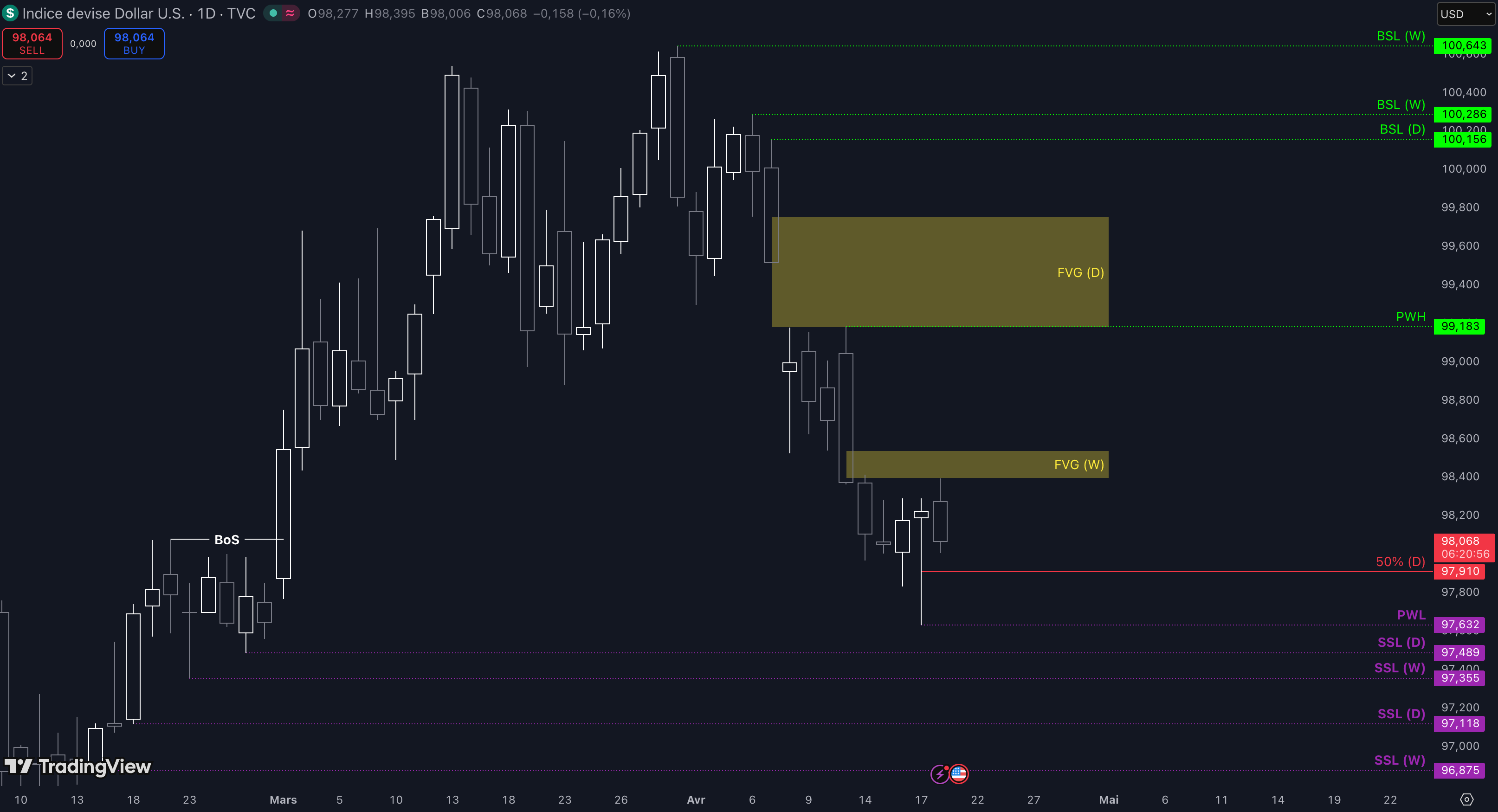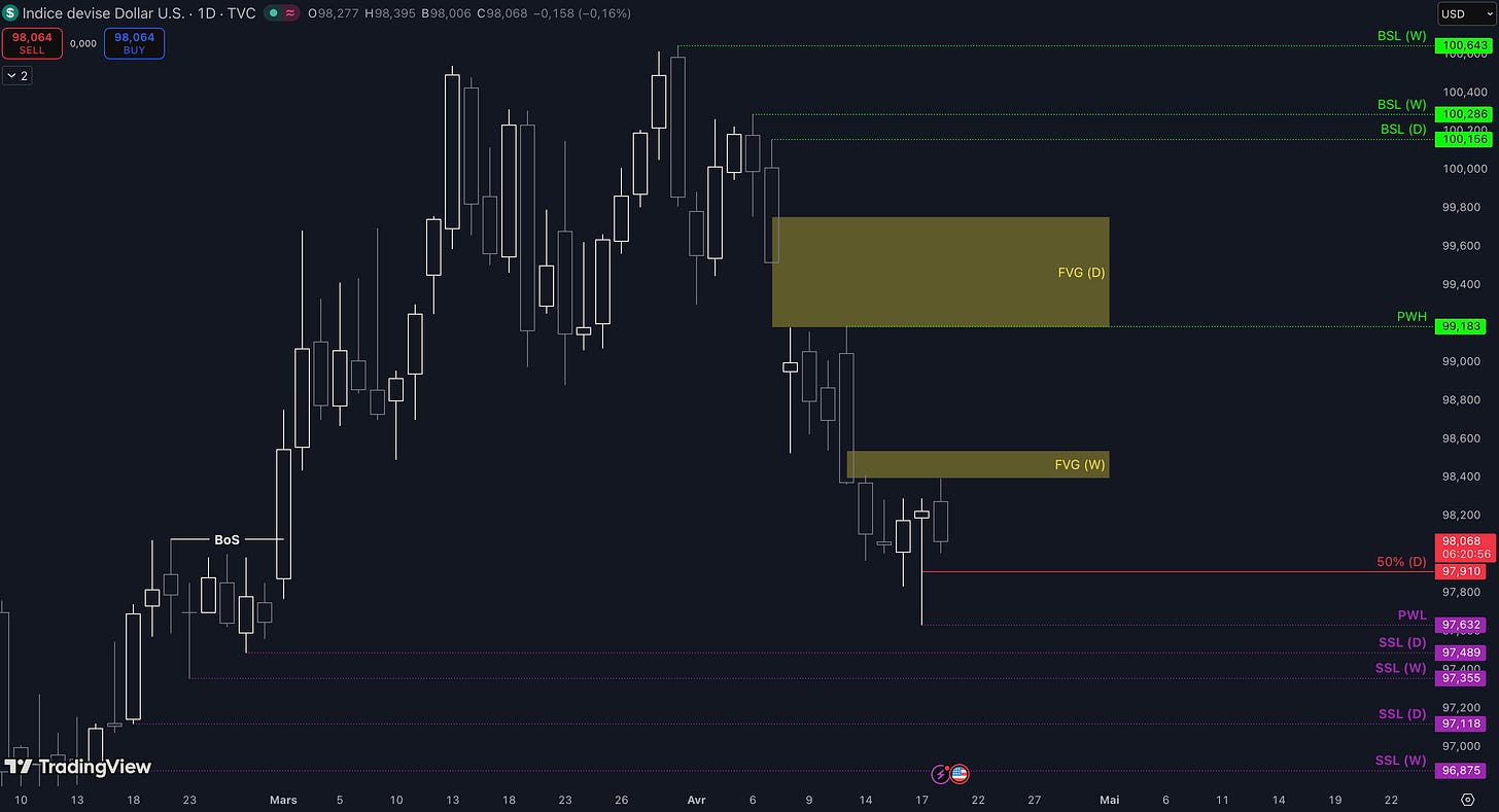 “Tant que le niveau à 99,75 $ ne sera pas cassé, c’est-à-dire qu’aucune clôture daily supérieure n’est validée, alors la dynamique restera baissière à court terme et les objectifs seront : la poche de liquidités entre 99,52 $ et 99,49 $ (target N°1), puis, si aucun bottom ne se forme dans la zone précédente, alors le prochain objectif sera le niveau à 97,76 $ (target N°2), enfin, si toujours aucun bottom ne se forme dans la zone précédente, alors le prochain objectif sera le niveau à 97,49 $ (target N°3)”.