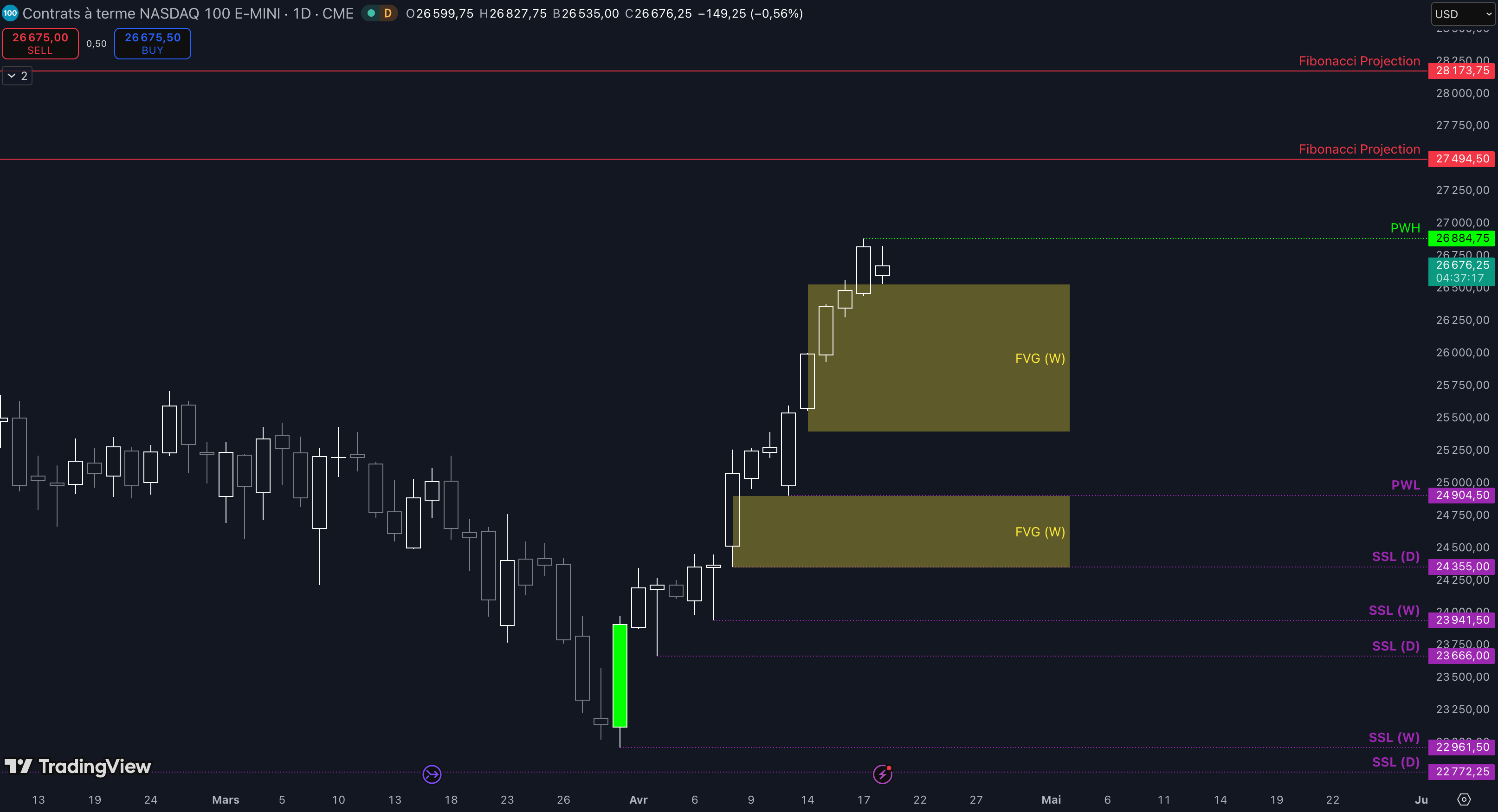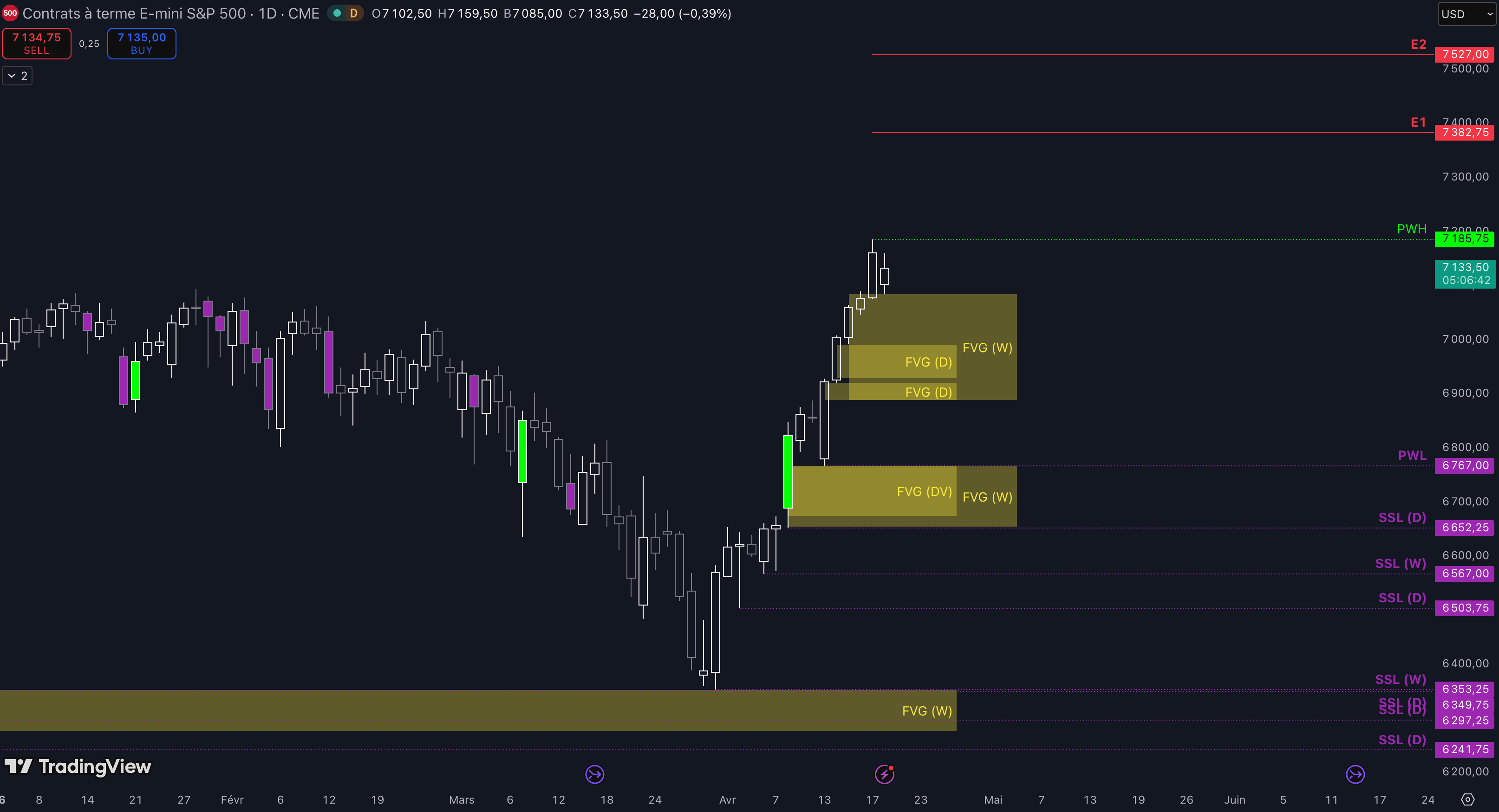 “Tant que les 6.673 $ sont maintenus, c’est-à-dire qu’aucune clôture daily inférieure n’est validée, alors la dynamique restera haussière à court terme et les objectifs seront : la poche de liquidités entre 6.888 $ et 6.916 $ (target N°1), puis, si aucun top ne se forme dans la zone précédente, alors le prochain objectif sera le niveau à 6.961 $ (target N°2), enfin, si toujours aucun top ne se forme dans la zone précédente, alors le prochain objectif sera le niveau à 7.001 $ (target N°3)”.