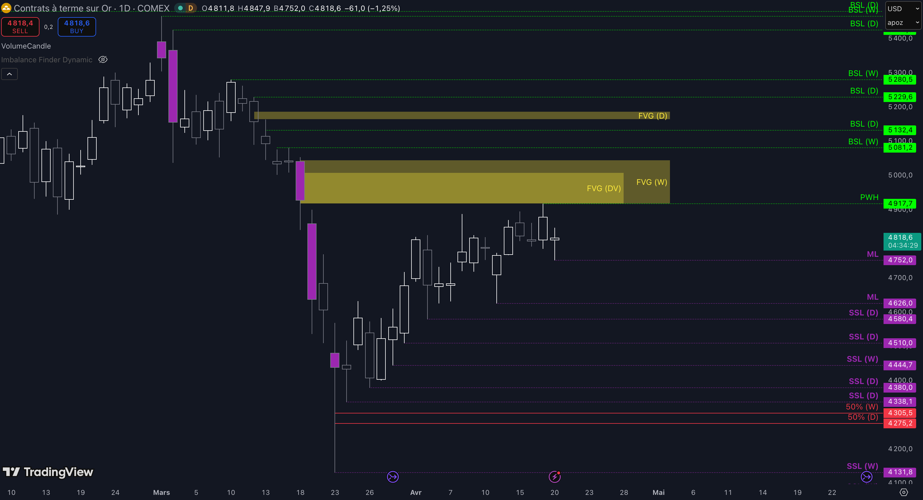 “Tant que le niveau à 5.045 $ ne sera pas cassé, c’est-à-dire qu’aucune clôture daily supérieure n’est validée, alors la dynamique restera baissière et les objectifs seront : le niveau à 4.626 $ (target N°1), puis, si aucun bottom ne se forme dans la zone précédente, alors le prochain objectif sera le niveau à 4.580 $ (target N°2)”.