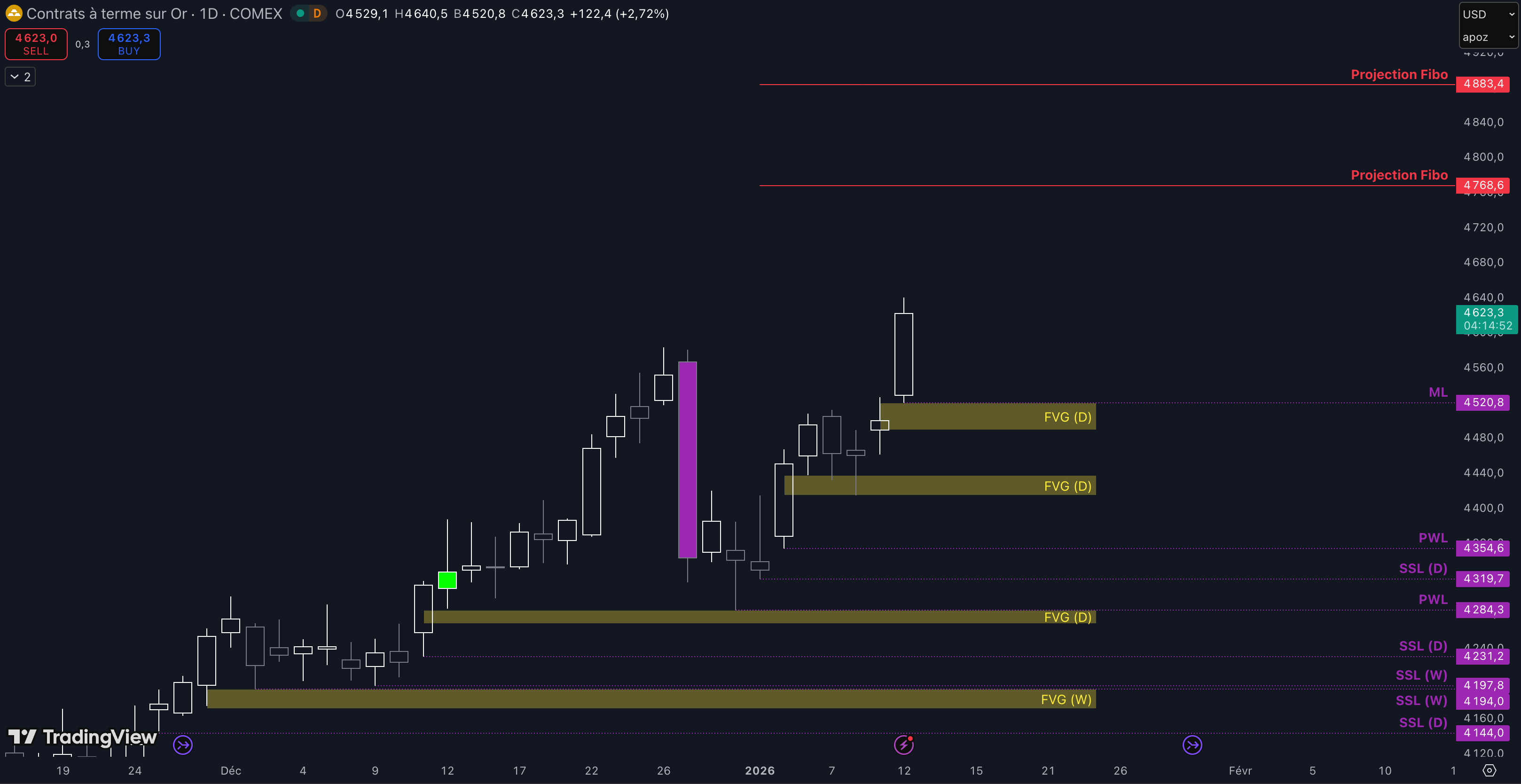 Tant que le Fair Value Gap (FVG) entre 4.490 $ et 4.520 $ ne sera pas cassé, c’est-à-dire qu’aucune clôture daily inférieure n’est validée, alors la dynamique restera haussière et les objectifs seront :