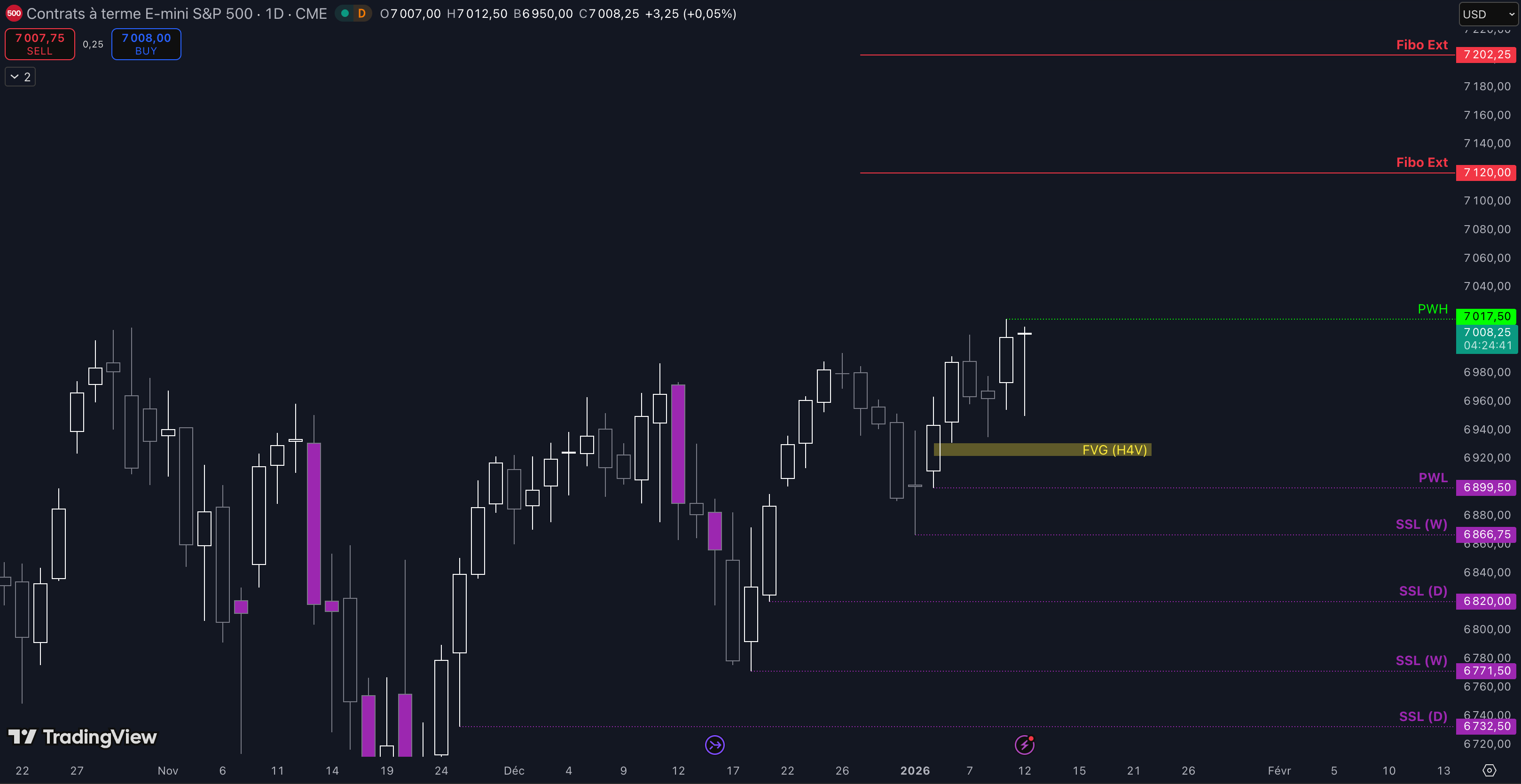 “Si le niveau à 6.940 $ est cassé par une clôture daily supérieure sans réintégration baissière du niveau ensuite, alors la dynamique deviendra haussière et les objectifs seront : la zone de liquidités entre 6.984 $ et 6.988 $ (target N°1), puis, si aucun top ne se forme dans la zone précédente, alors le prochain objectif sera le niveau à 7.011 $ (target N°2)”.