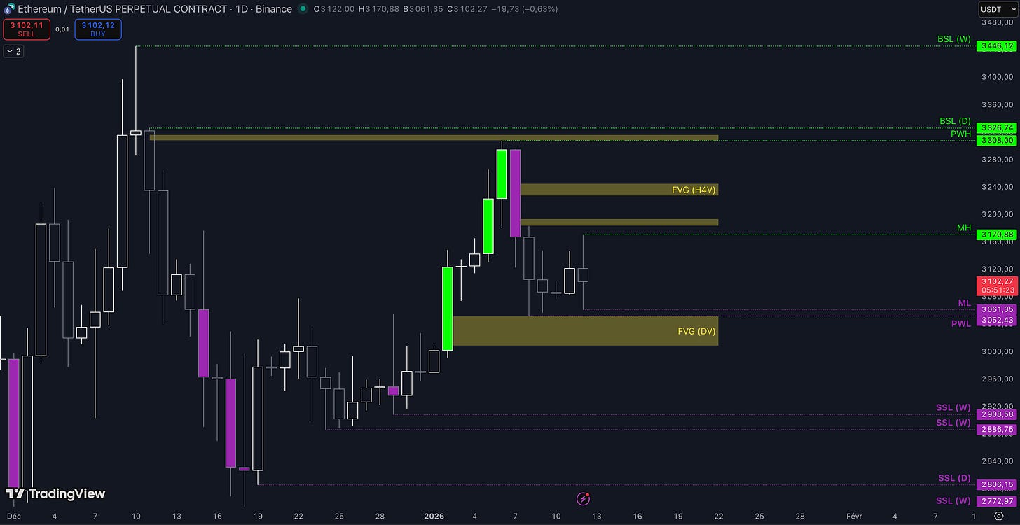 En revanche, si le Fair Value Gap (FVG) est cassé par une clôture daily inférieure à 3.008 $ sans réintégration haussière du niveau ensuite, alors la dynamique deviendra baissière et les objectifs seront :