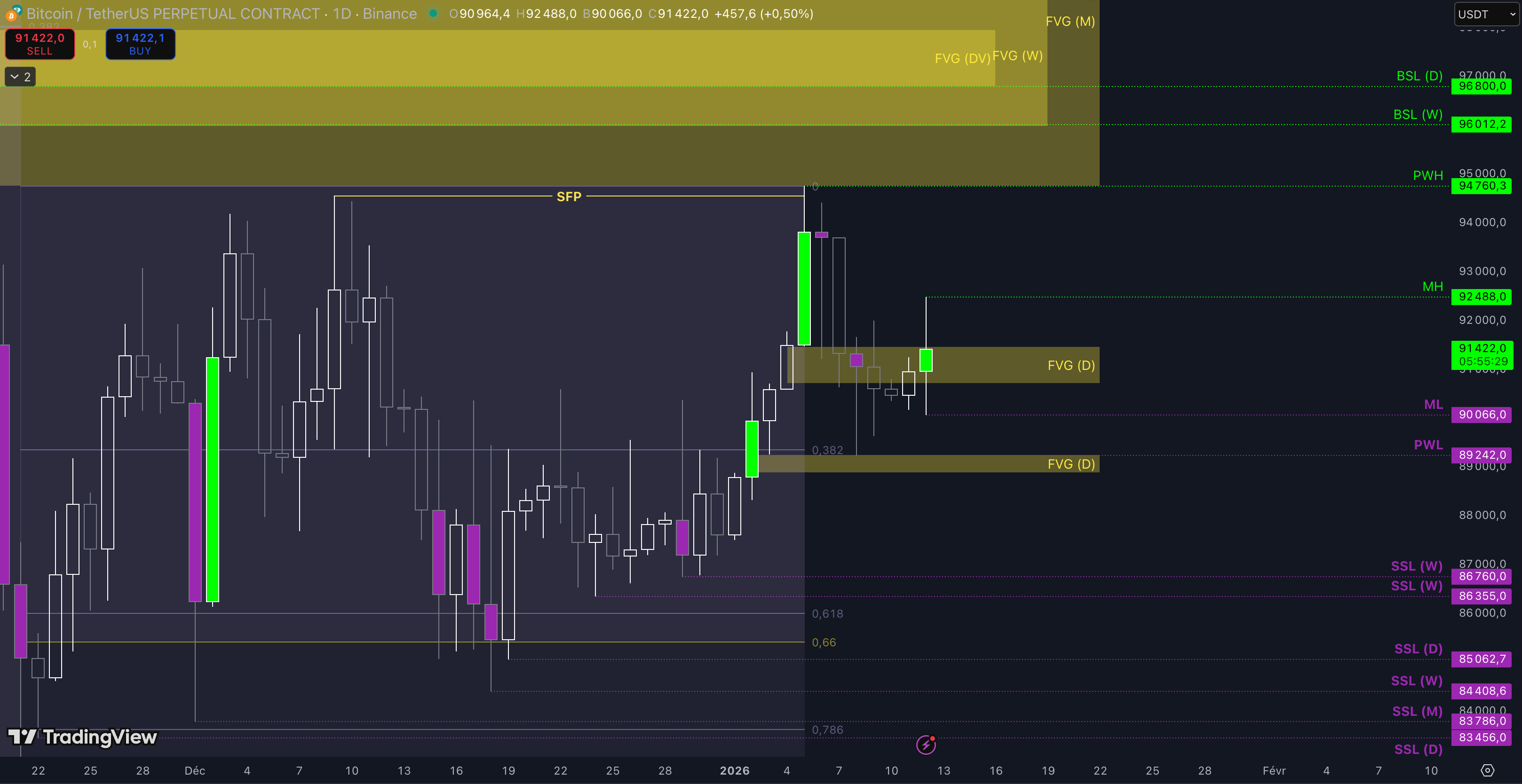 En revanche, si le Fair Value Gap (FVG) est cassé par une clôture daily inférieure à 90.716 $ sans réintégration haussière du niveau ensuite, alors la dynamique deviendra baissière et les objectifs seront :