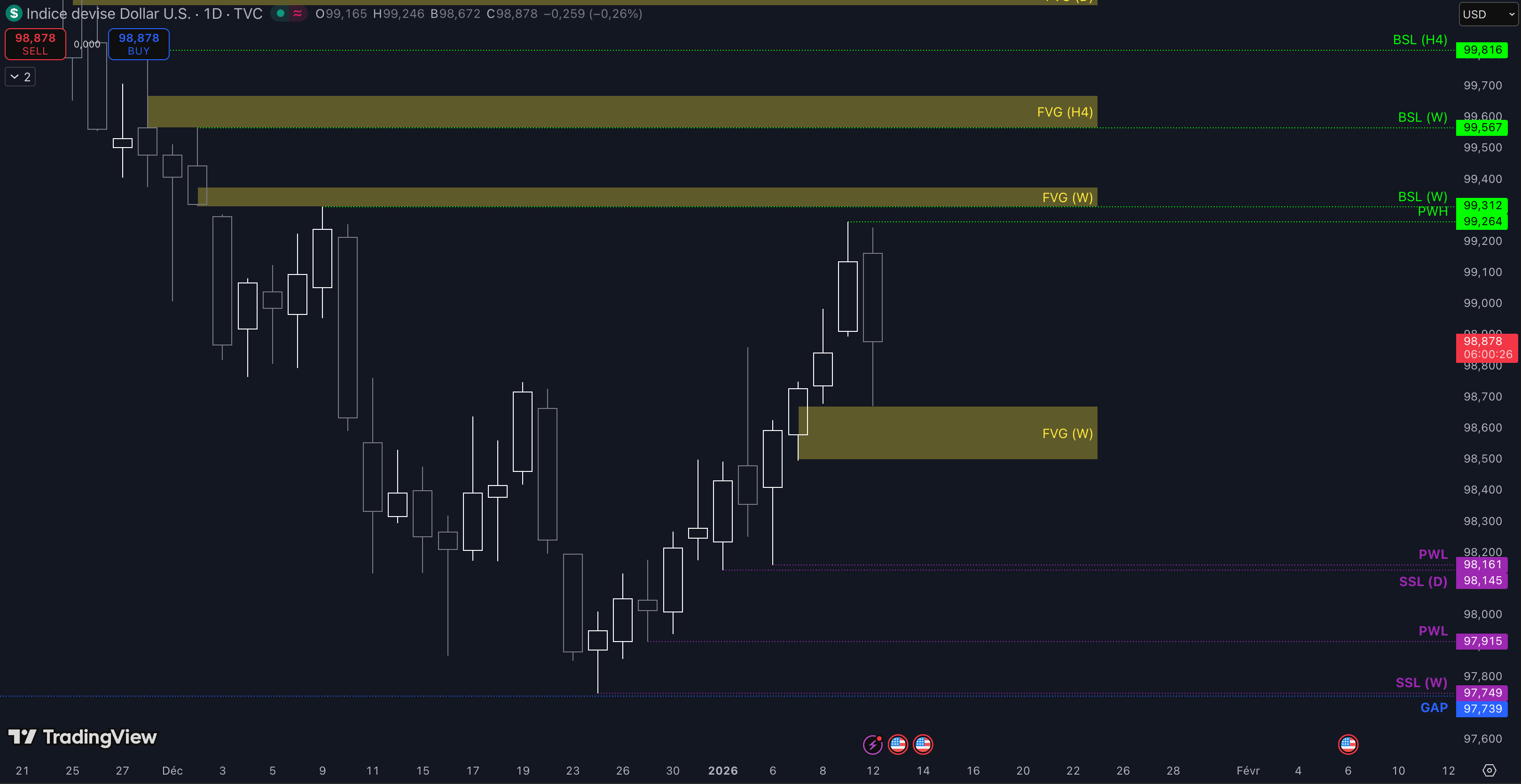 Tant que le Fair Value Gap (FVG) entre 98,49 $ et 98,67 $ sera maintenu, c’est-à-dire qu’aucune clôture daily inférieure n’est validée, alors la dynamique restera haussière à court terme et les objectifs seront :