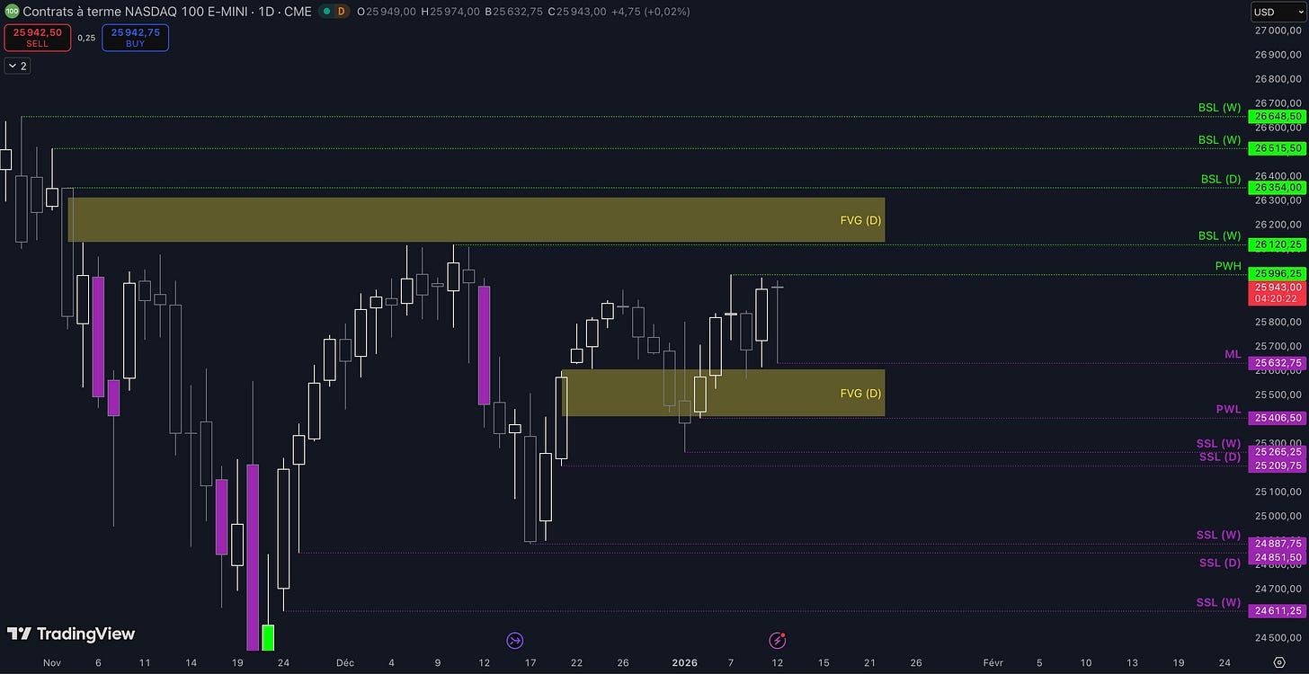 “Tant que le Fair Value Gap (FVG) entre 25.412 $ et 25.608 $ est maintenu, c’est-à-dire qu’aucune clôture daily inférieure n’est validée, alors la dynamique restera haussière et les objectifs seront : le niveau à 25.893 $ (target N°1), puis, si aucun top ne se forme dans la zone précédente, alors le prochain objectif sera le niveau à 25.982 $ (target N°2)”.