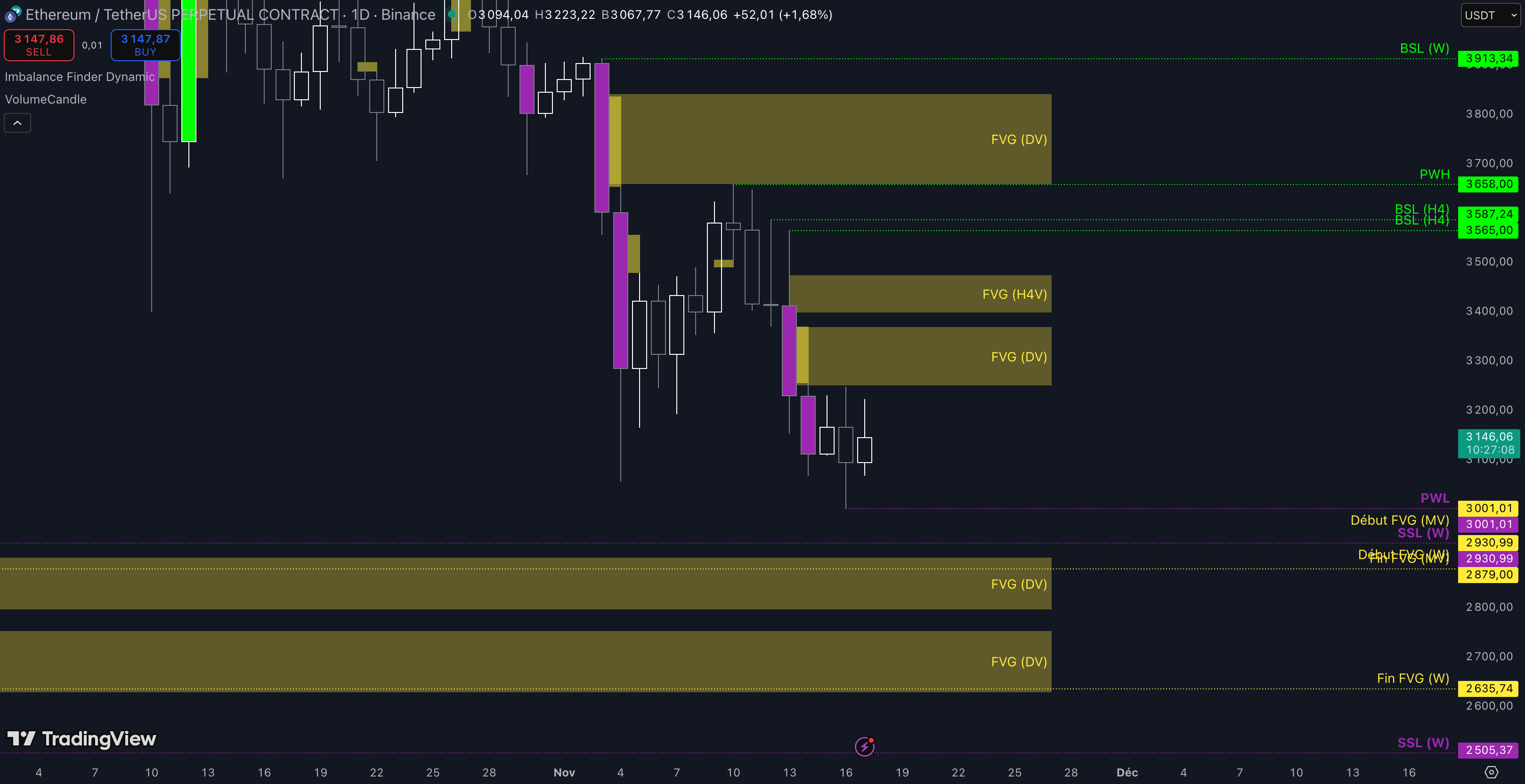 Tant que le Fair Value Gap (FVG) entre 3.251 $ et 3.370 $ n’est pas cassé, c’est-à-dire qu’aucune clôture daily supérieure n’est validée, alors la dynamique restera baissière à court terme et les objectifs seront :