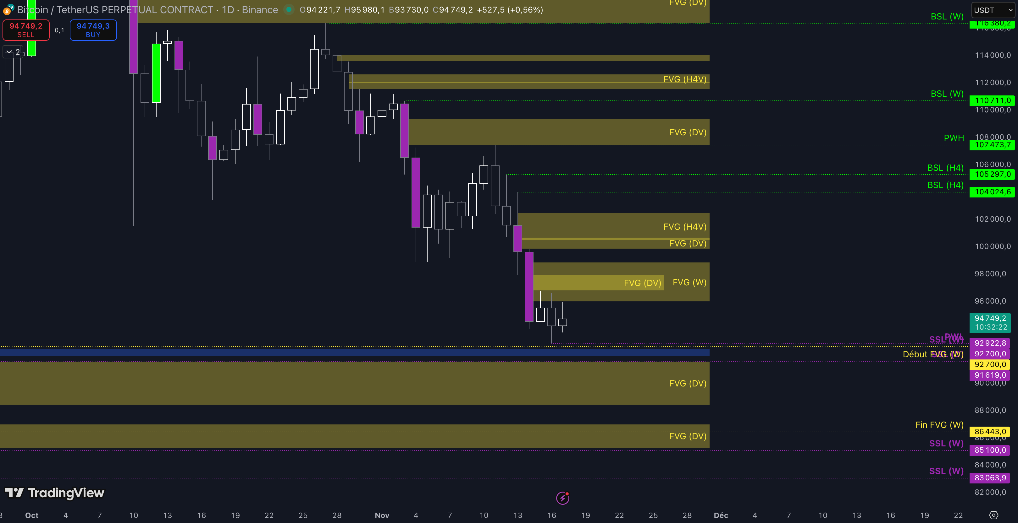 Tant que le Fair Value Gap (FVG) entre 96.012 $ et 98.864 $ n’est pas cassé, c’est-à-dire qu’aucune clôture daily supérieure n’est validée, alors la dynamique restera baissière à court terme et les objectifs seront :