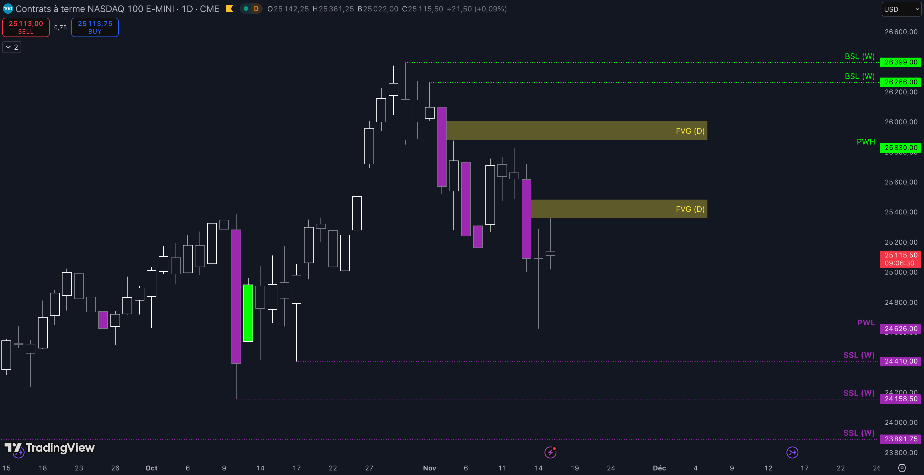 Tant que le Fair Value Gap (FVG) entre 25.365 $ et 25.529 $ n’est pas cassé, c’est-à-dire qu’aucune clôture daily supérieure n’est validée, alors la dynamique restera baissière et les objectifs seront :