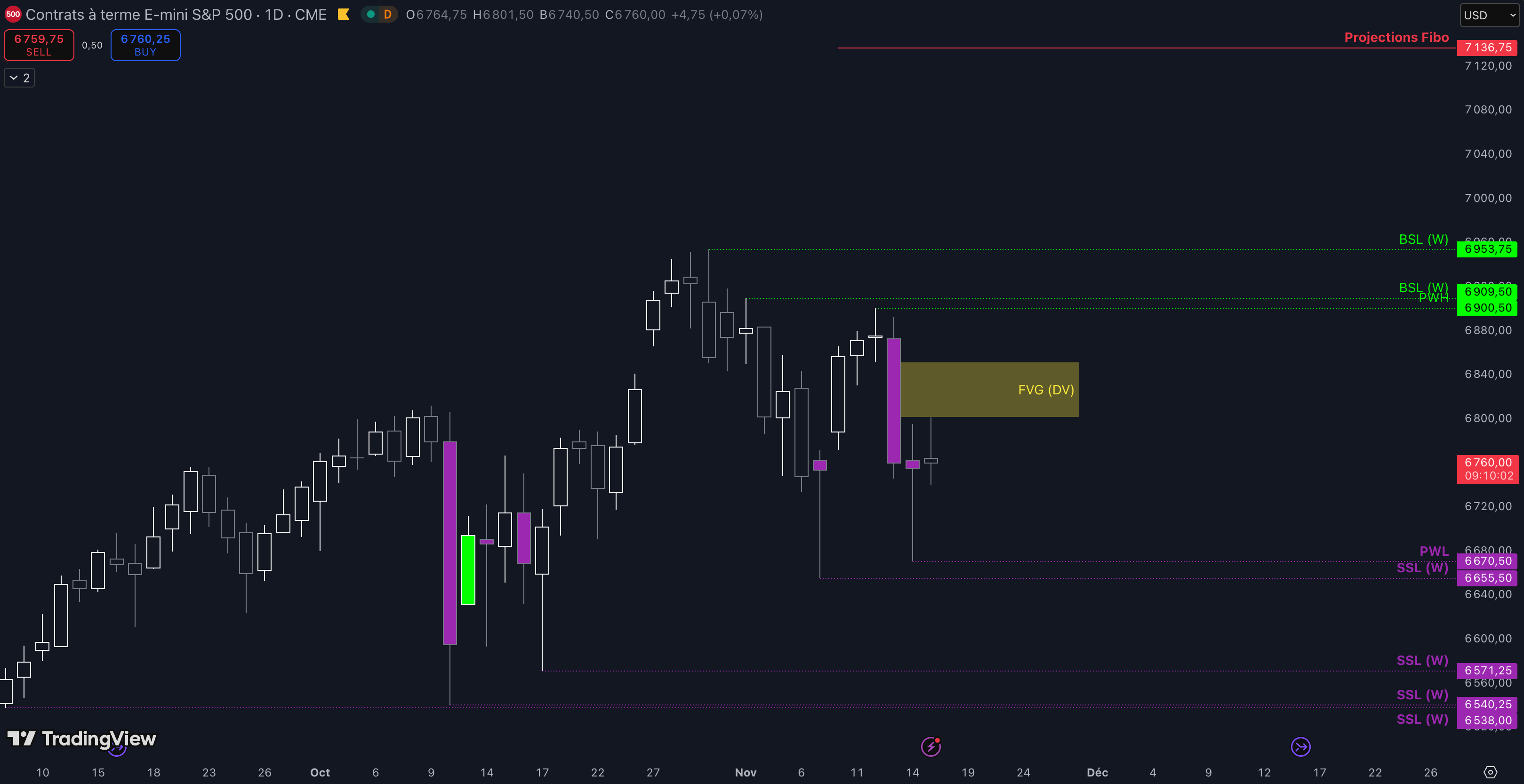Tant que le Fair Value Gap (FVG) entre 6.802 $ et 6.851 $ n’est pas cassé, c’est-à-dire qu’aucune clôture daily supérieure n’est validée, alors la dynamique restera baissière et les objectifs seront :