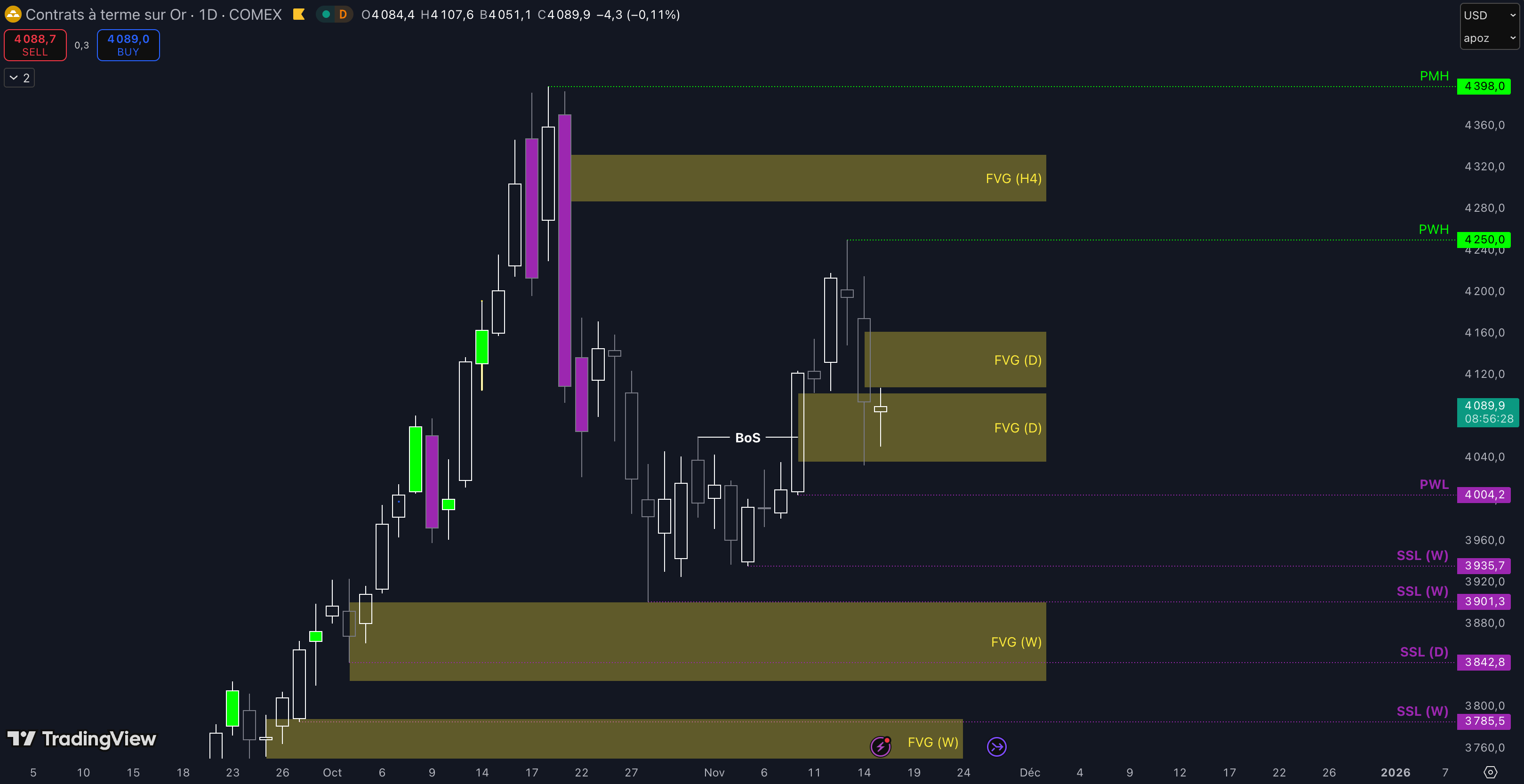 Tant que le Fair Value Gap (FVG) entre 4.034 $ et 4.102 $ est maintenu, c’est-à-dire qu’aucune clôture daily inférieure n’est validée, alors la dynamique restera haussière et les objectifs seront :
