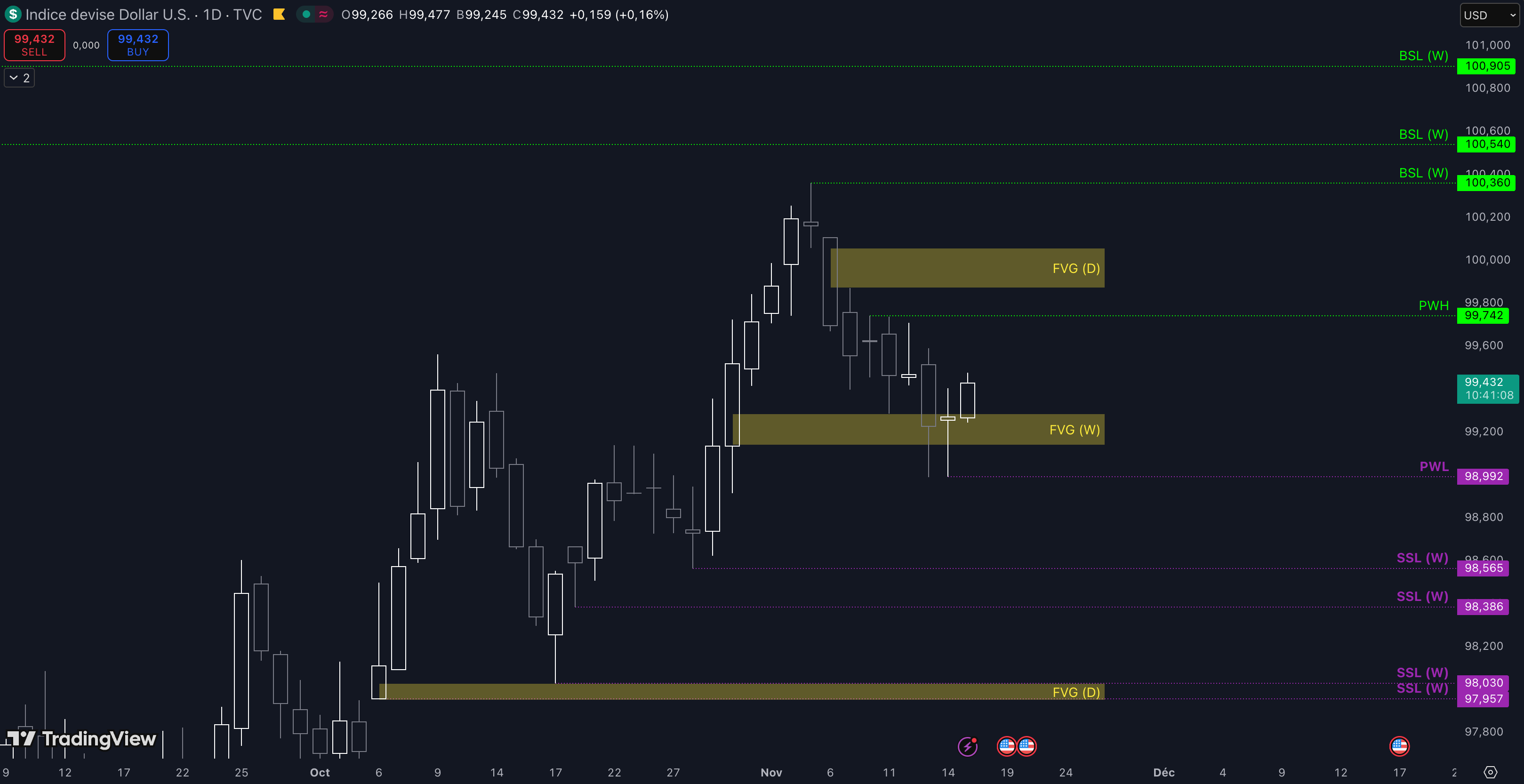 “Tant que le Fair Value Gap (FVG) entre 99,14 $ et 99,41 $ est maintenu, c’est-à-dire qu’aucune clôture daily inférieure n’est validée, alors la dynamique restera haussière à court terme et les objectifs seront : le niveau à 100,36 $ (target N°1), puis, si aucun top ne se forme dans la zone précédente, alors le prochain objectif sera le niveau à 100,54 $ (target N°2)”.