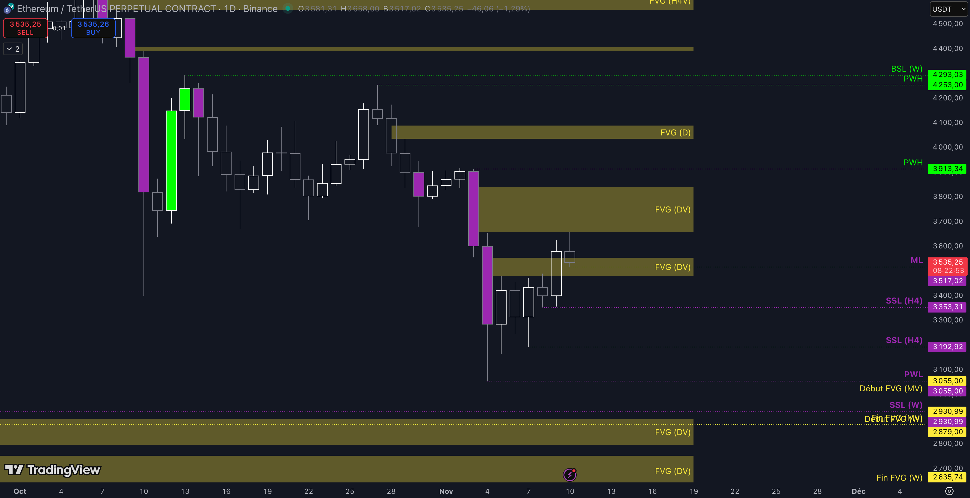 Tant que le Fair Value Gap (FVG) entre 3.480 $ et 3.554 $ n’est pas cassé, c’est-à-dire qu’aucune clôture daily supérieure n’est validée, alors la dynamique restera baissière à court terme et les objectifs seront :