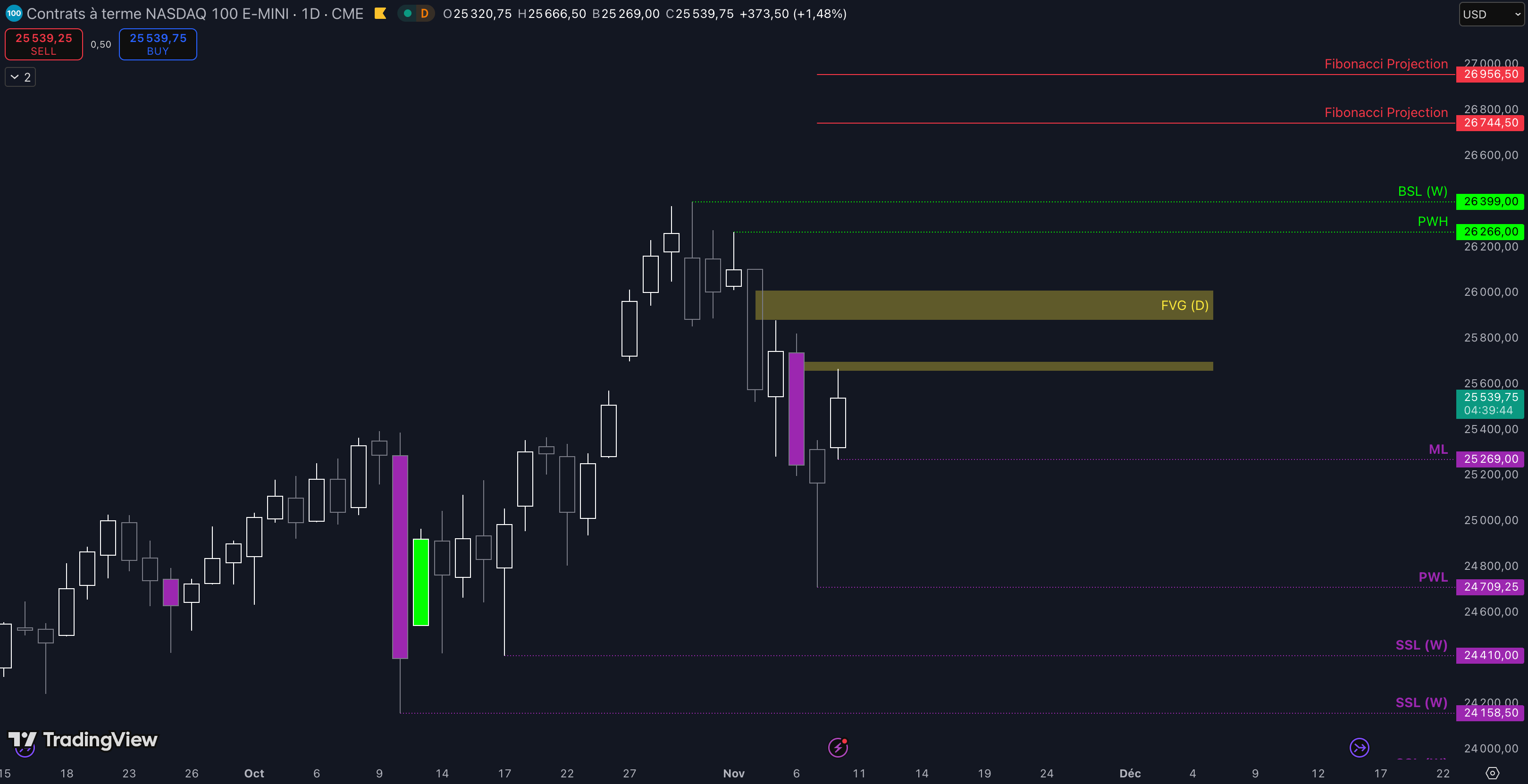 Tant que le Fair Value Gap (FVG) entre 25.658 $ et 25.698 $ n’est pas cassé, c’est-à-dire qu’aucune clôture daily supérieure n’est validée, alors la dynamique restera baissière et les objectifs seront :