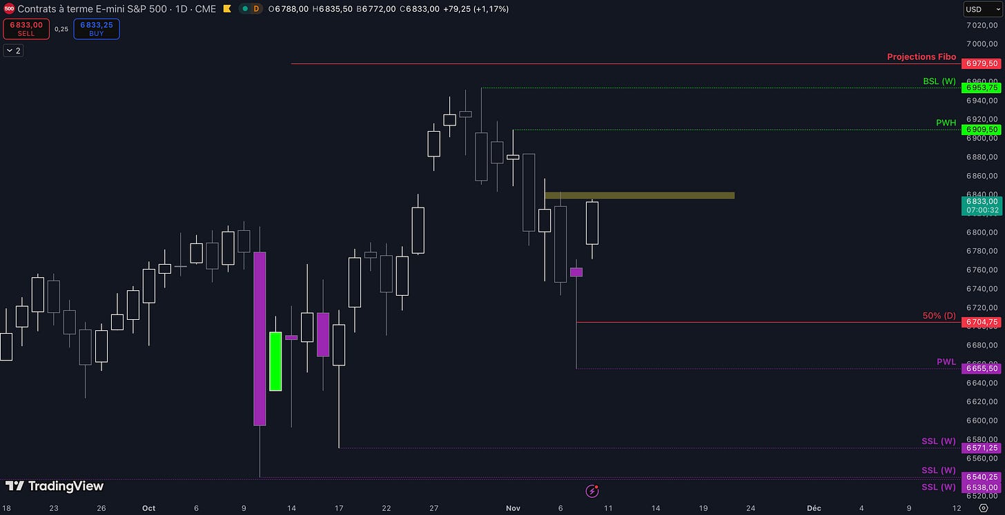 Tant que le Fair Value Gap (FVG) entre 6.835 $ et 6.843 $ n’est pas cassé, c’est-à-dire qu’aucune clôture daily supérieure n’est validée, alors la dynamique restera baissière et les objectifs seront :