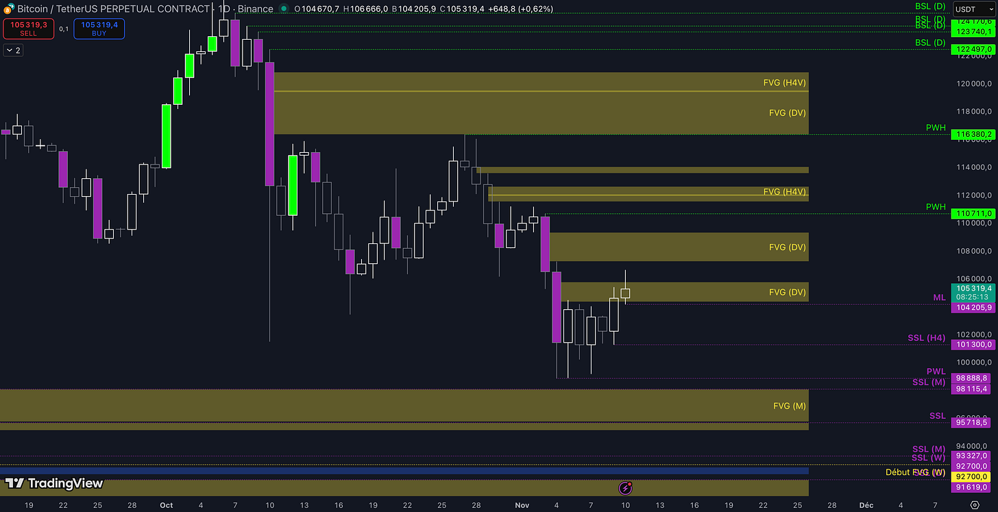 Tant que le Fair Value Gap (FVG) entre 104.401 $ et 105.793 $ n’est pas cassé, c’est-à-dire qu’aucune clôture daily supérieure n’est validée, alors la dynamique restera baissière à court terme et les objectifs seront :