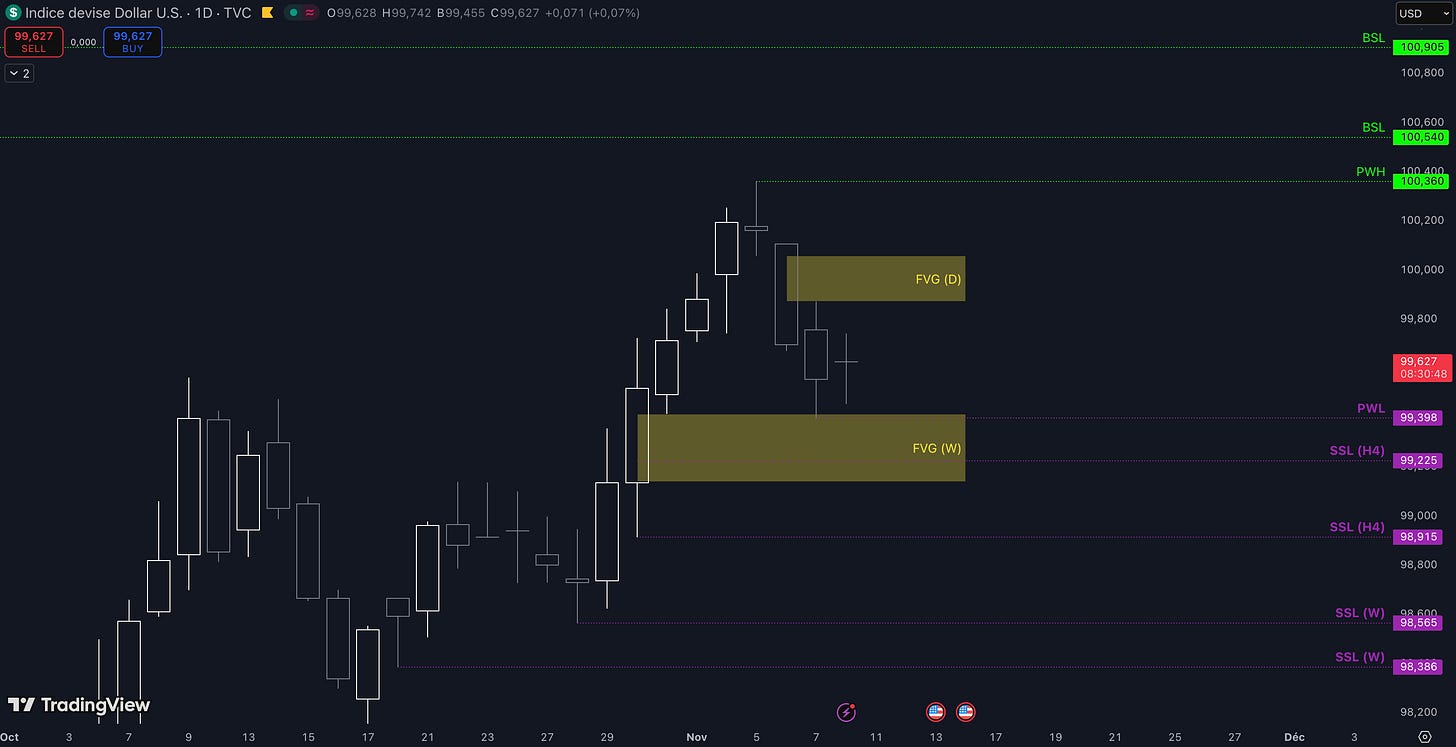 “Tant que le Fair Value Gap (FVG) entre 99,35 $ et 99,41 $ est maintenu, c’est-à-dire qu’aucune clôture daily inférieure n’est validée, alors la dynamique restera haussière à court terme et les objectifs seront : le niveau à 100,25 $ (target N°1), puis, si aucun top ne se forme dans la zone précédente, alors le prochain objectif sera le niveau à 100,54 $ (target N°2)”.