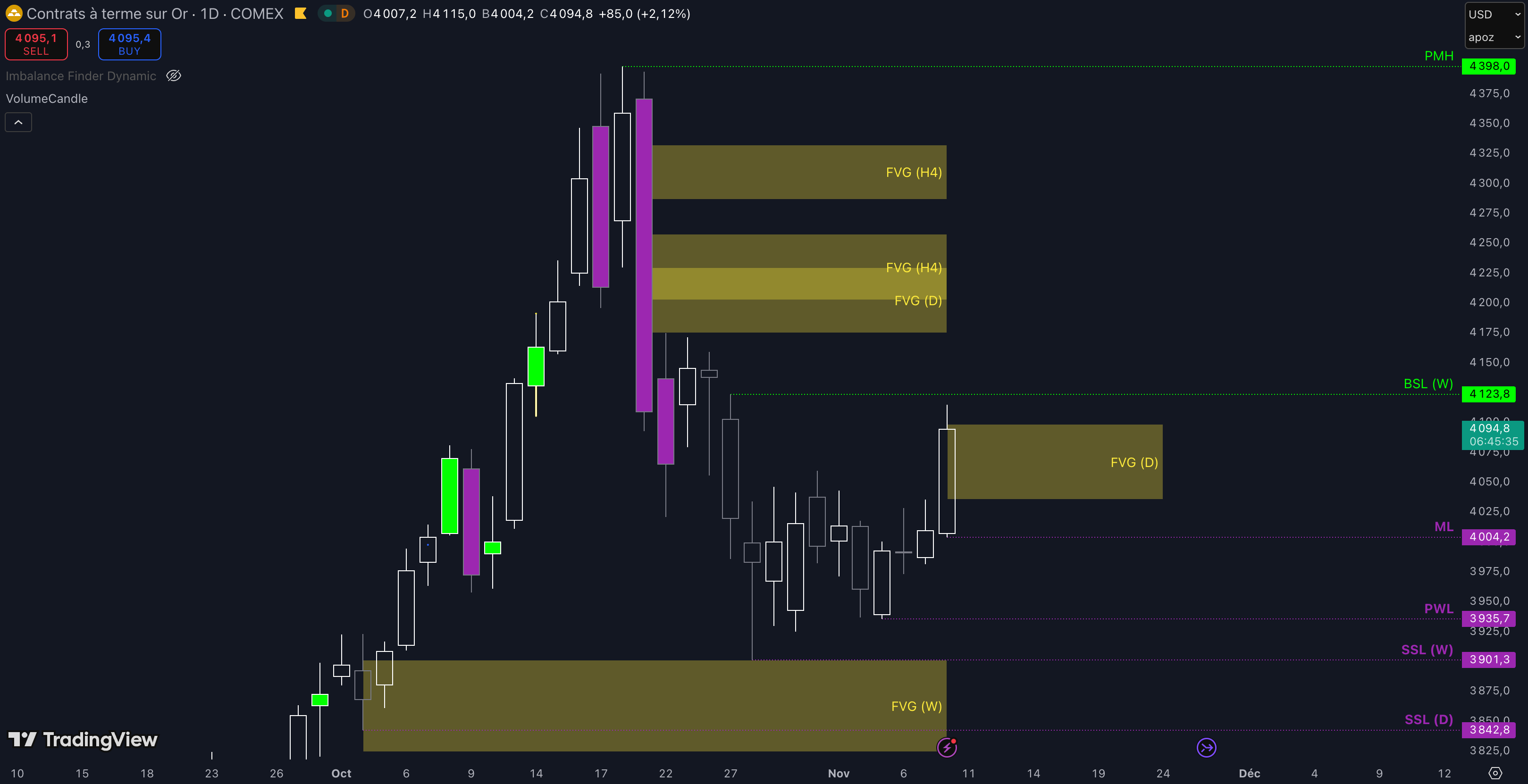 Tant que le Fair Value Gap (FVG) daily en cours de création n’est pas cassé, dont la borne basse pointe à 4.036 $, alors la dynamique restera haussière à court terme et les objectifs seront :