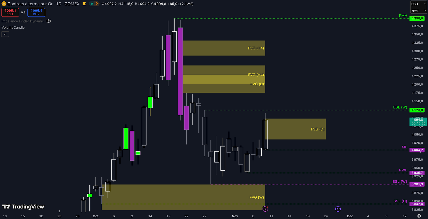 “Tant que le Fair Value Gap (FVG) entre 4.034 $ et 4.055 $ n’est pas cassé, c’est-à-dire qu’aucune clôture daily supérieure n’est validée, alors la dynamique restera baissière à court terme et les objectifs seront : le niveau à 3.901 $ (target N°1), puis, si aucun bottom ne se forme dans la zone précédente, alors le prochain objectif sera le niveau à 3.842 $ (target N°2)”.