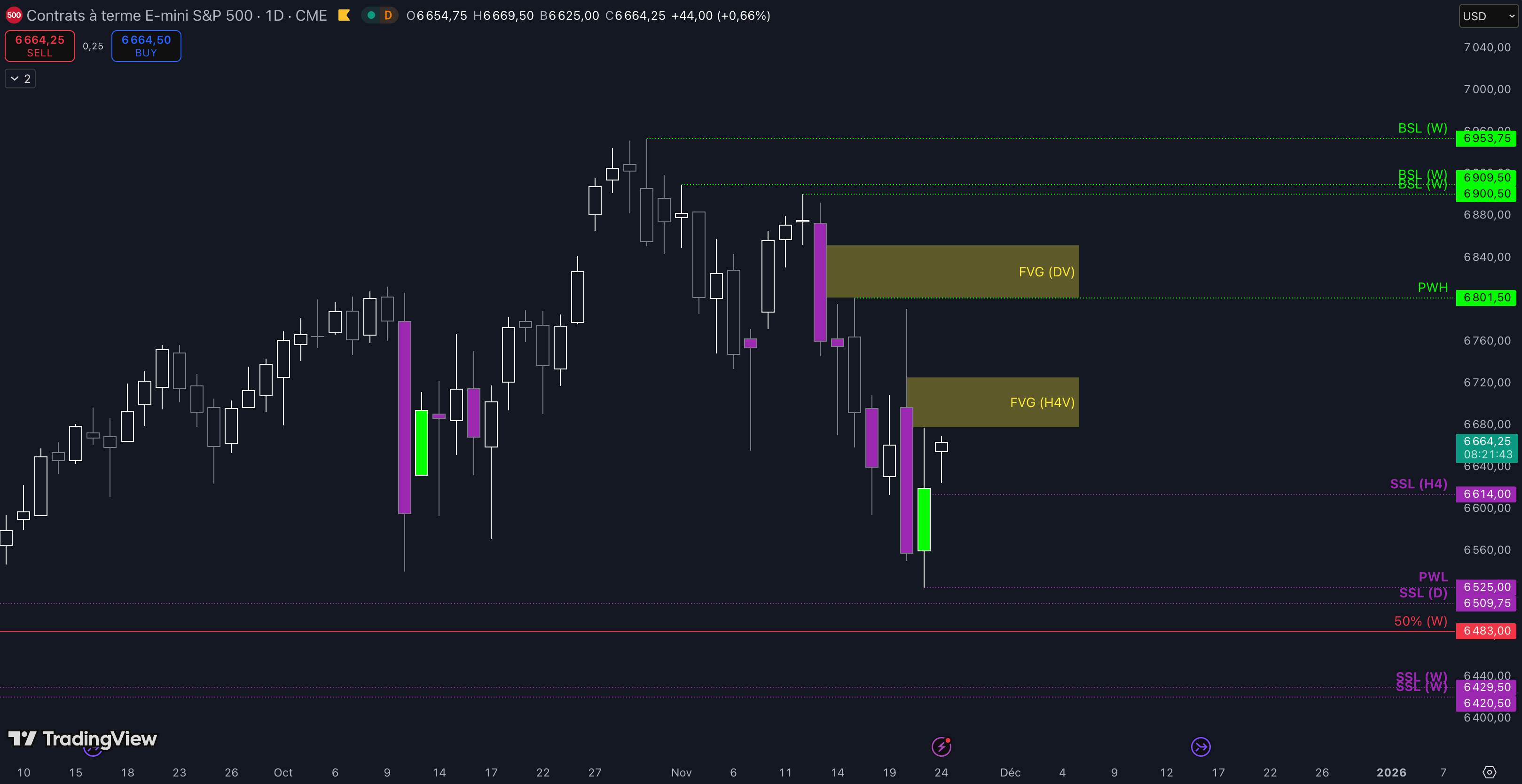 Tant que le Fair Value Gap (FVG) entre 6.678 $ et 6.725 $ n’est pas cassé, c’est-à-dire qu’aucune clôture daily supérieure n’est validée, alors la dynamique restera baissière et les objectifs seront :