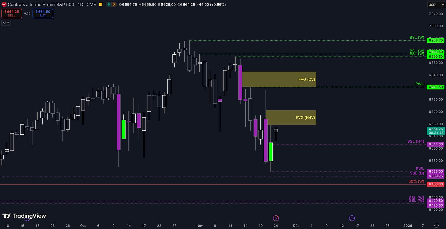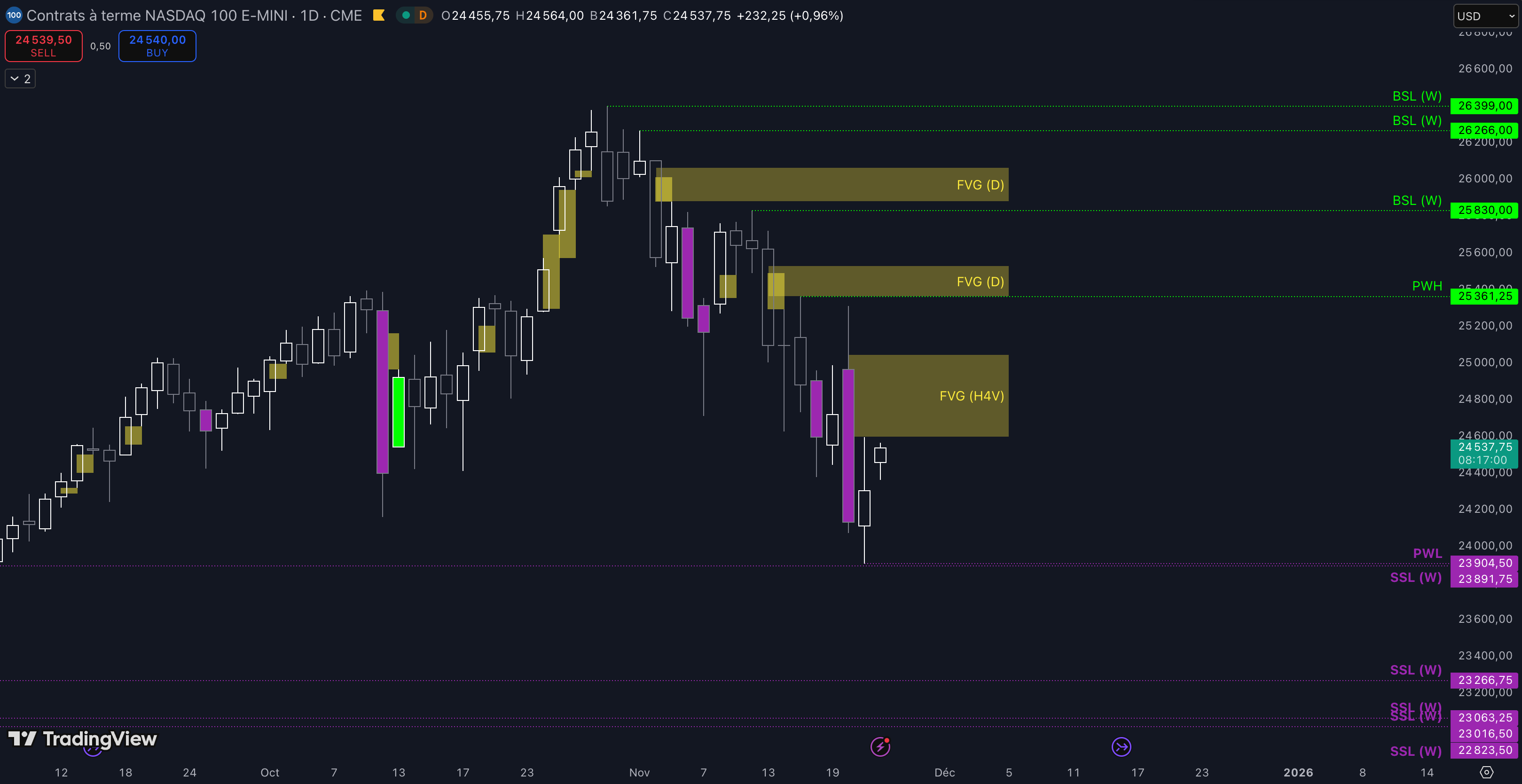 Tant que le Fair Value Gap (FVG) entre 24.600 $ et 25.041 $ n’est pas cassé, c’est-à-dire qu’aucune clôture daily supérieure n’est validée, alors la dynamique restera baissière et les objectifs seront :