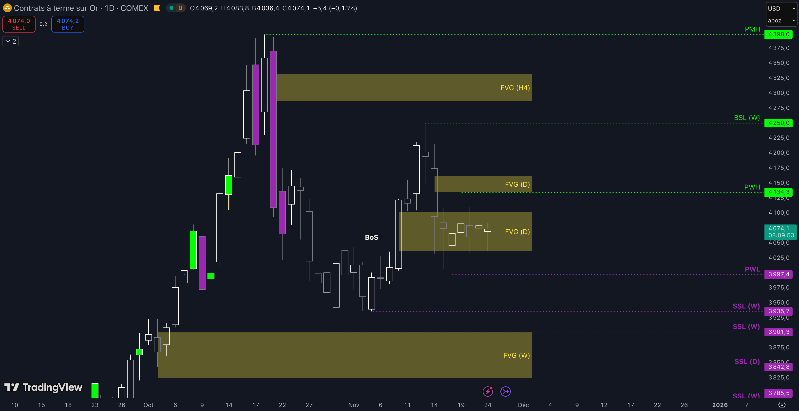 Tant que le Fair Value Gap (FVG) entre 4.034 $ et 4.102 $ est maintenu, c’est-à-dire qu’aucune clôture daily inférieure n’est validée, alors la dynamique restera haussière et les objectifs seront :