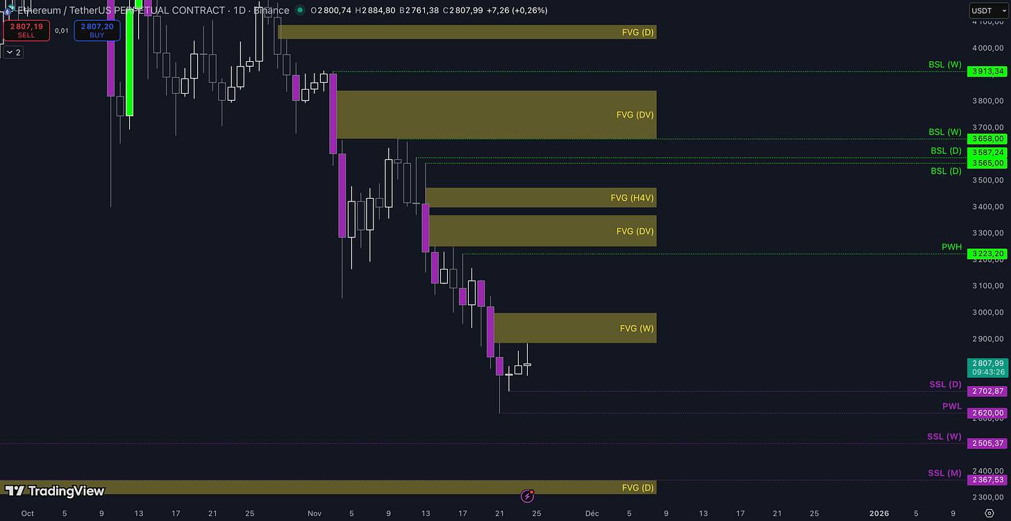 Tant que le Fair Value Gap (FVG) entre 2.884 $ et 3.001 $ n’est pas cassé, c’est-à-dire qu’aucune clôture daily supérieure n’est validée, alors la dynamique restera baissière à court terme et les objectifs seront :