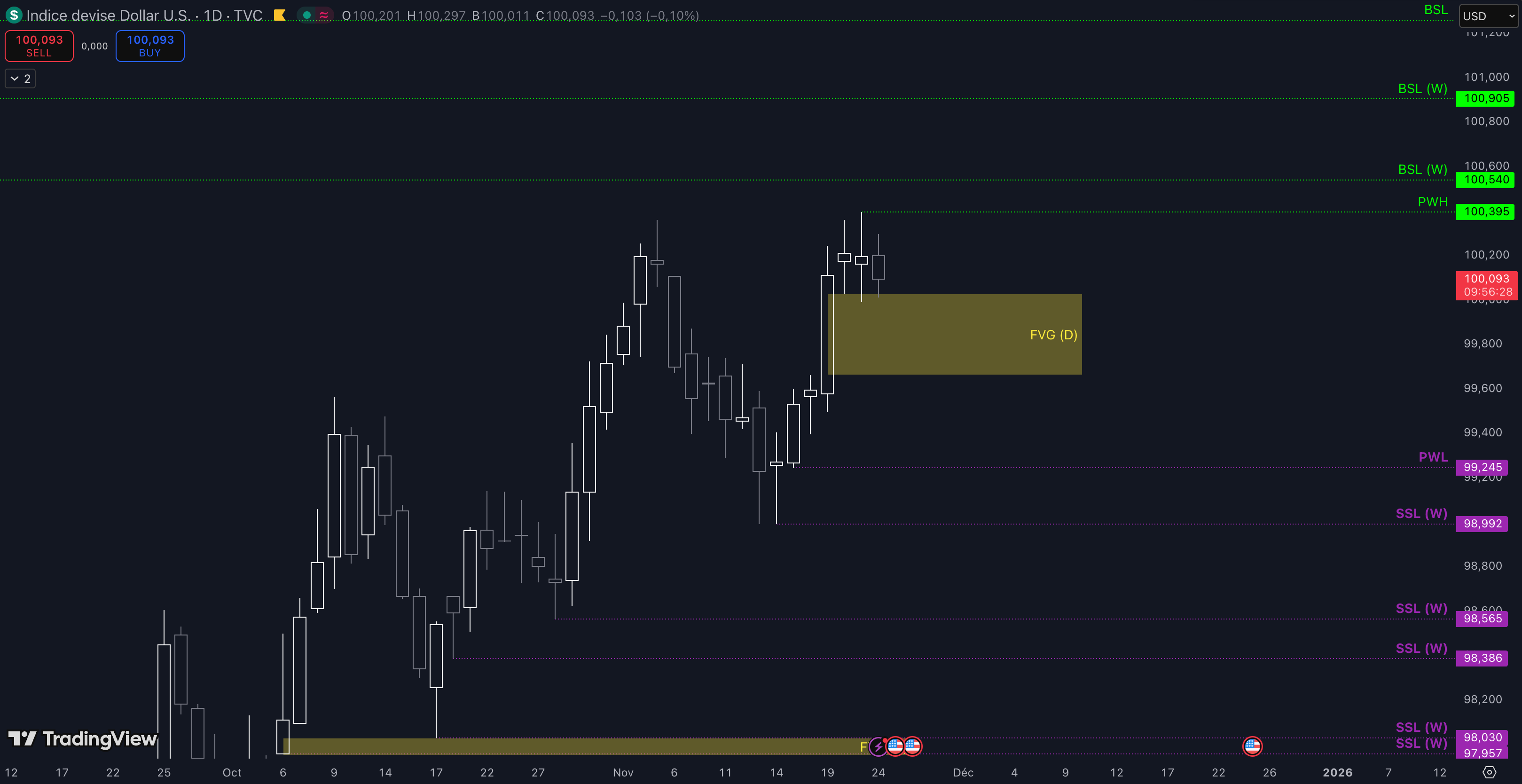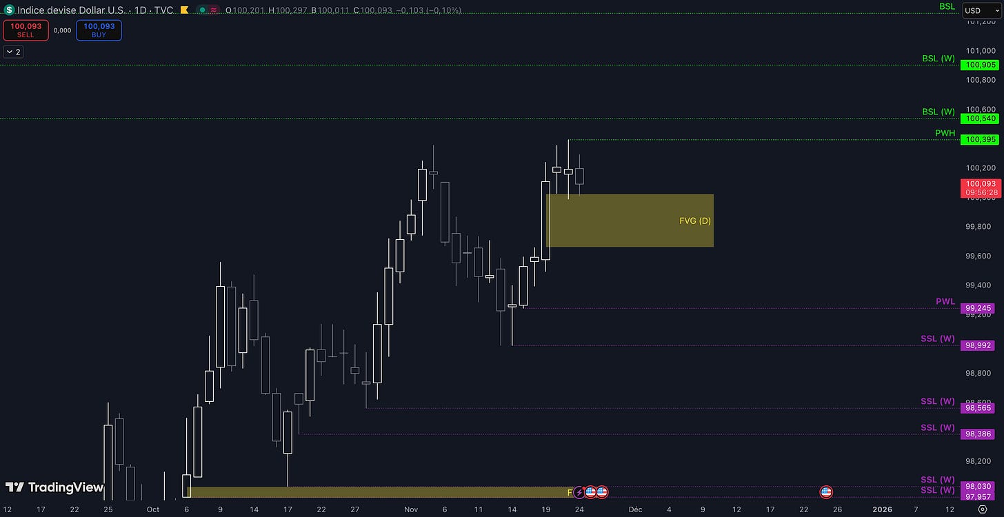 Tant que le Fair Value Gap (FVG) entre 99,66 $ et 99,99 $ est maintenu, c’est-à-dire qu’aucune clôture daily inférieure n’est validée, alors la dynamique restera haussière à court terme et les objectifs seront :