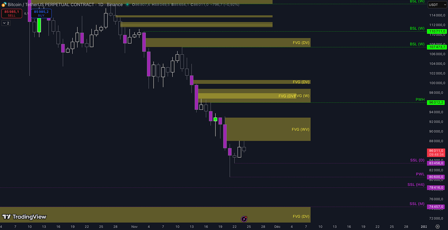 Tant que le Fair Value Gap (FVG) entre 88.100 $ et 92.922 $ n’est pas cassé, c’est-à-dire qu’aucune clôture daily supérieure n’est validée, alors la dynamique restera baissière à court terme et les objectifs seront :