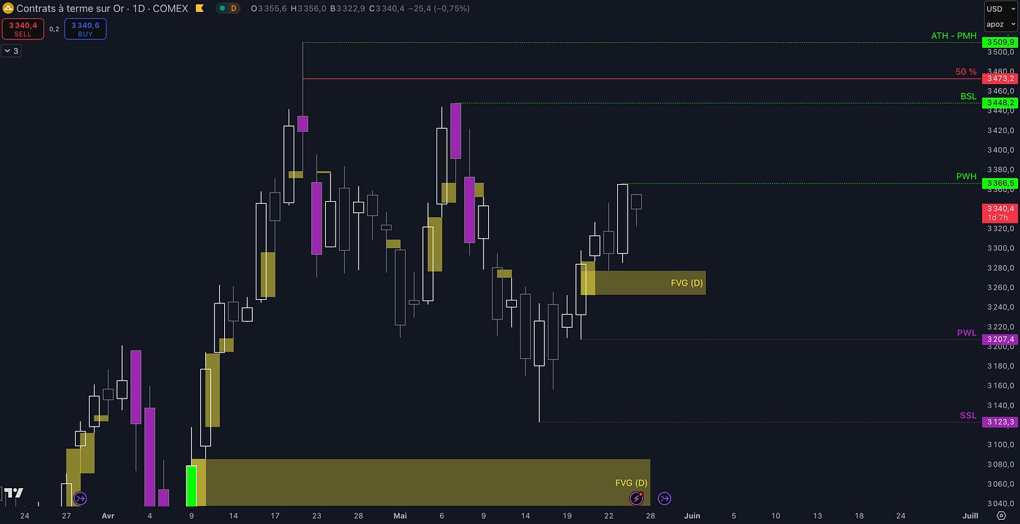 Ainsi, tant que le Fair Value Gap (FVG) entre 3.277 $ et 3.253 $ est maintenu, c’est-à-dire qu’aucune clôture daily inférieure n’est validée, alors la dynamique restera haussière et les objectifs seront :