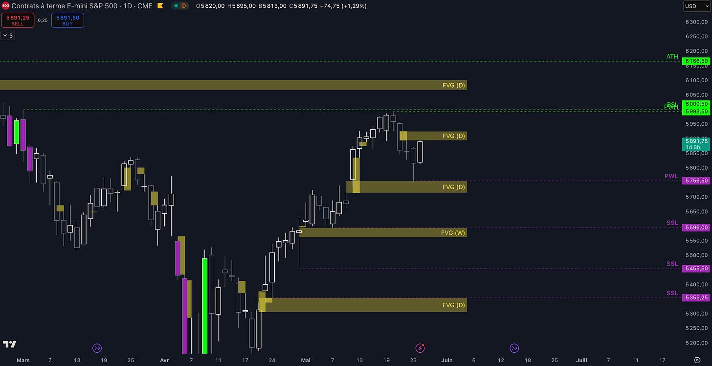 Puis, si aucun top ne se forme dans la zone précédente, alors le prochain objectif sera la poche de liquidités entre 5.993 $ et 6.000 $ (target N°2) ;