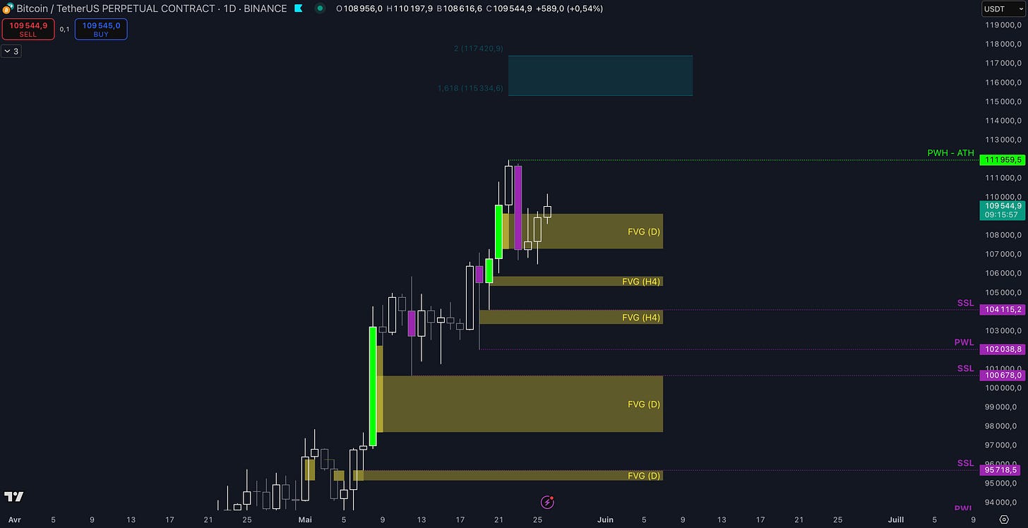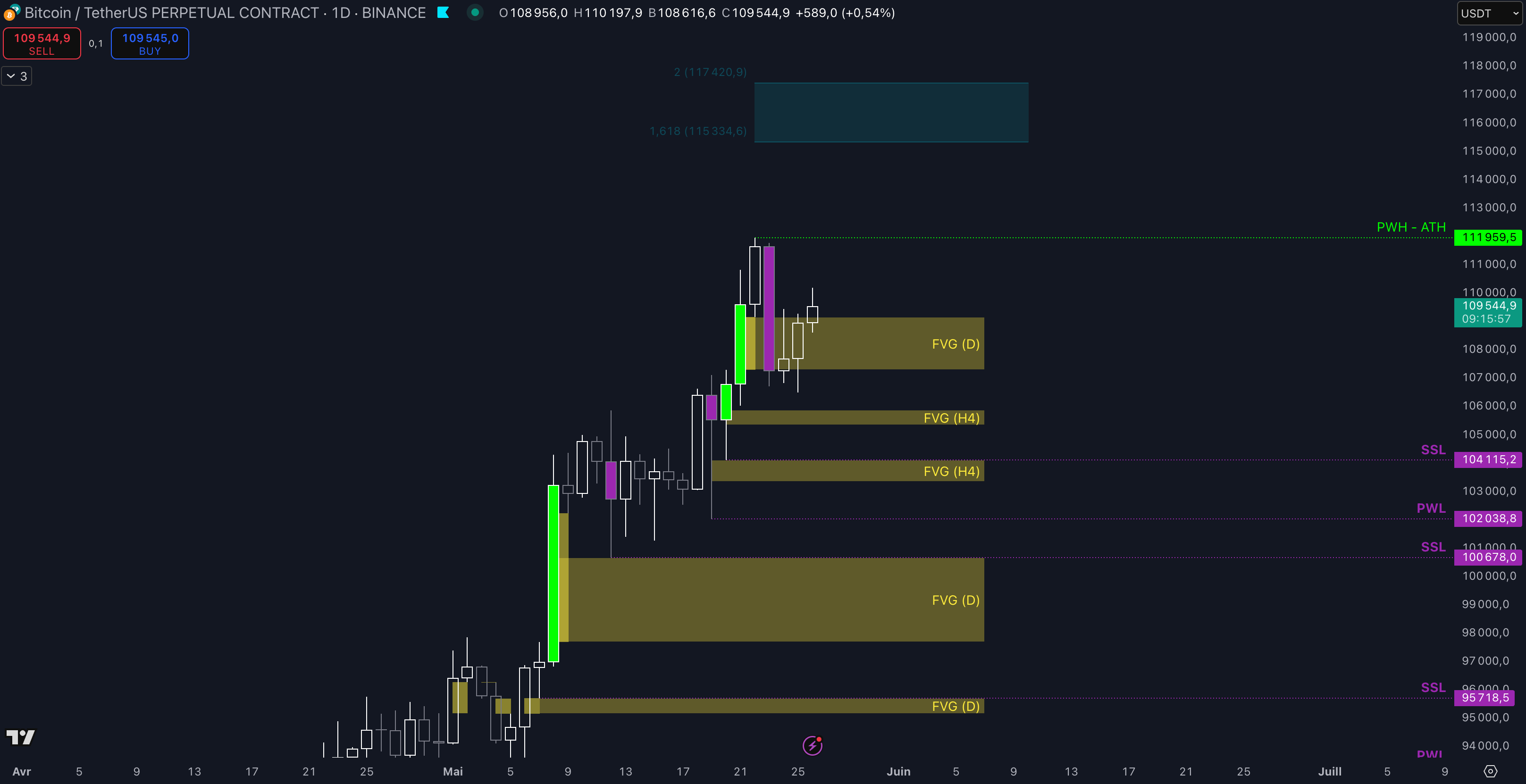 Tant que le Fair Value Gap (FVG) entre 107.330 $ et 109.127 $ est maintenu, c’est-à-dire qu’aucune clôture daily inférieure n’est validée, alors la dynamique restera haussière et les objectifs seront :