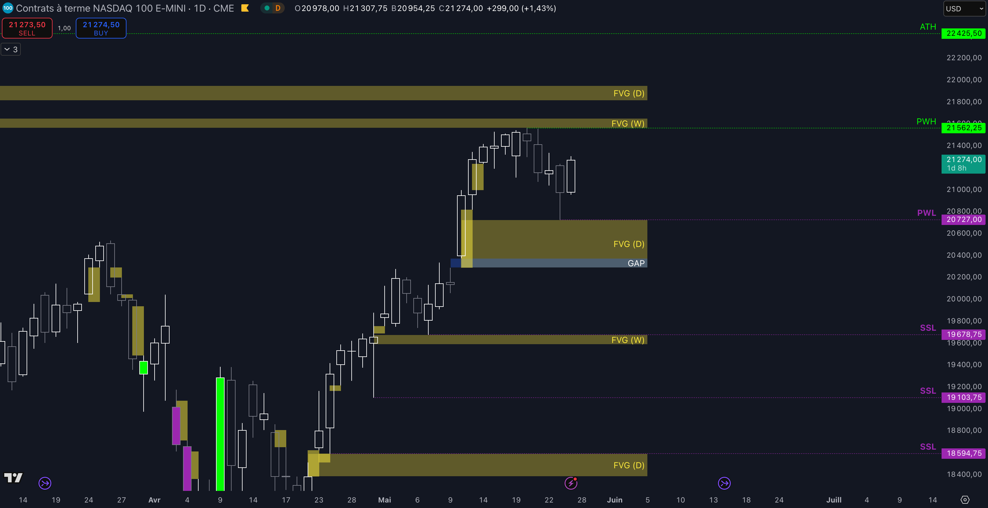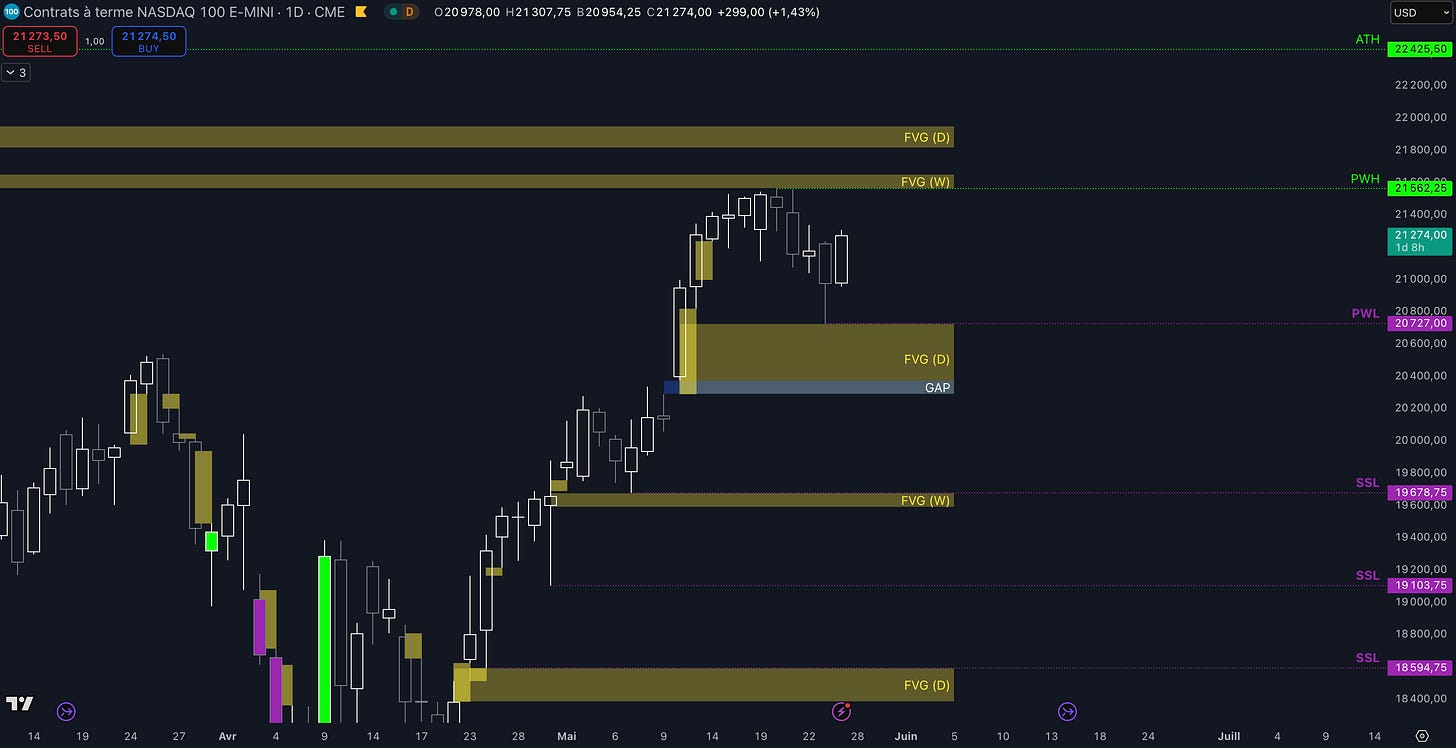 Depuis la réintégration du Fair Value Gap (FVG) entre 21.106 $ et 21.004 $, la dynamique demeure haussière et les objectifs seront :