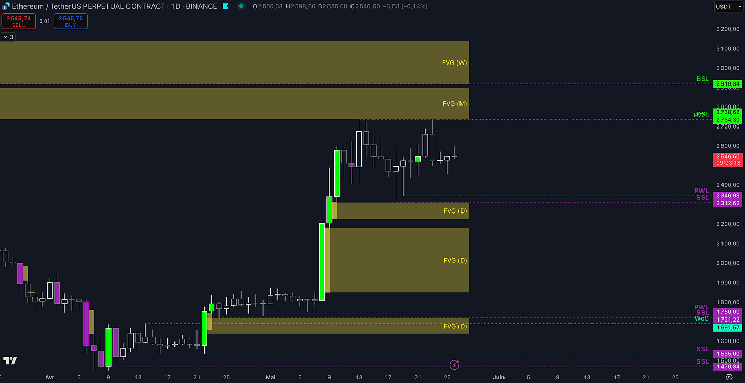 Tant que le Fair Value Gap (FVG) entre 2.312 $ et 2.229 $ est maintenu, c’est-à-dire qu’aucune clôture daily inférieure n’est validée, alors la dynamique restera haussière et les objectifs seront :