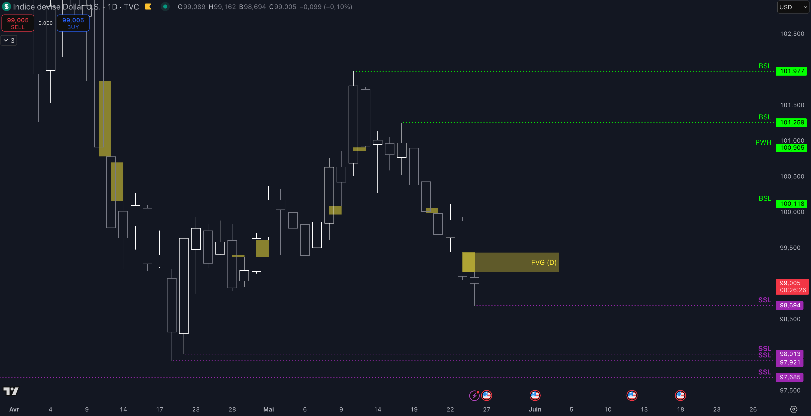 Tant que le Fair Value Gap (FVG) entre 99,16 $ et 99,44 $ ne sera pas cassé, c’est-à-dire qu’aucune clôture daily supérieure n’est validée sans réintégration, alors la dynamique restera baissière et les objectifs seront :