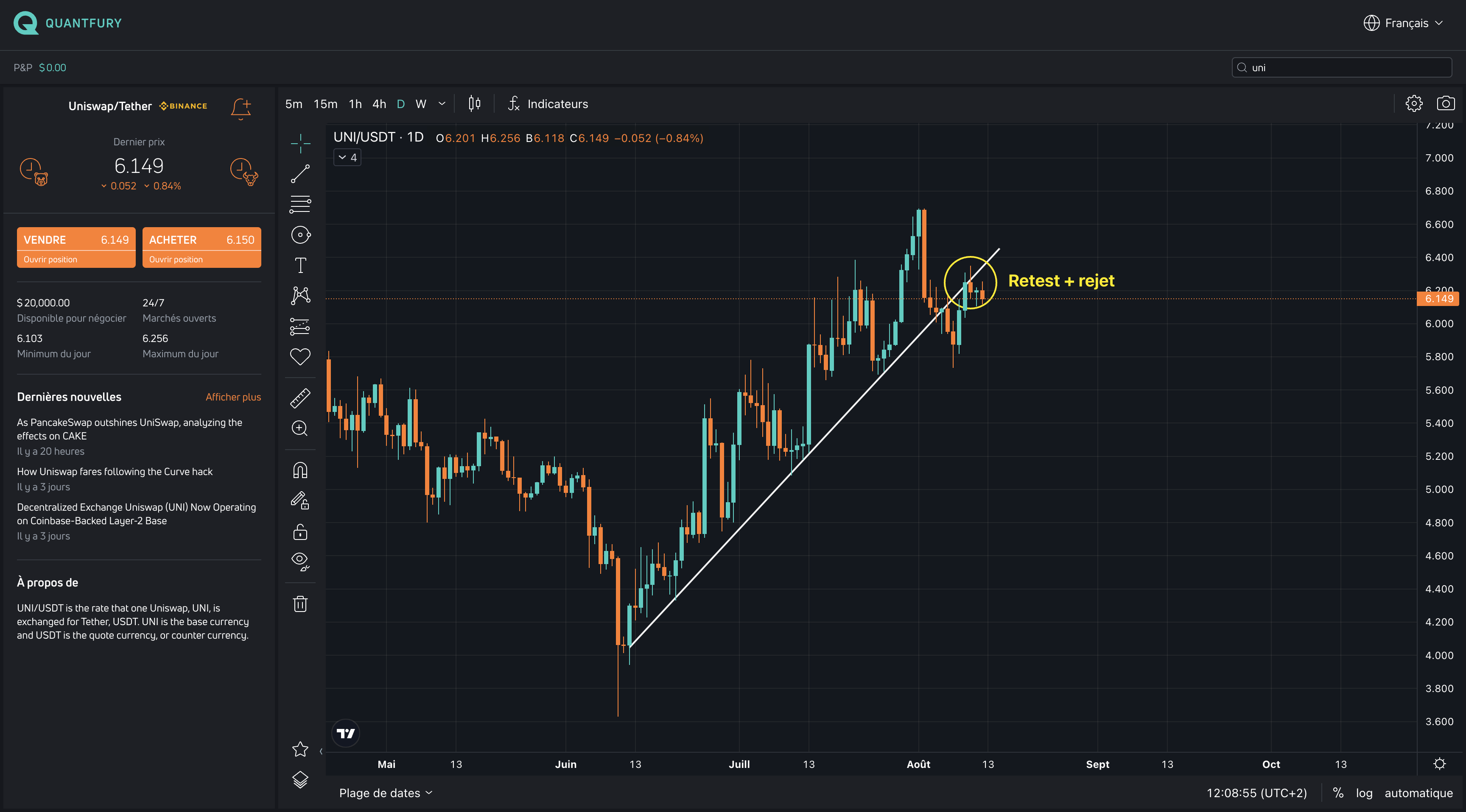 PS : Quant au marchĂ© altcoins, beaucoup dâentre eux sont en train de retester la trendline quâils ont cassĂ© la semaine passĂ© (Cf Ă©dition N°70 de Beatmarket) donc si le BTC dĂ©croche ce sera un signal de SHORT sur les alts (exemple ci-dessous avec UNI).
