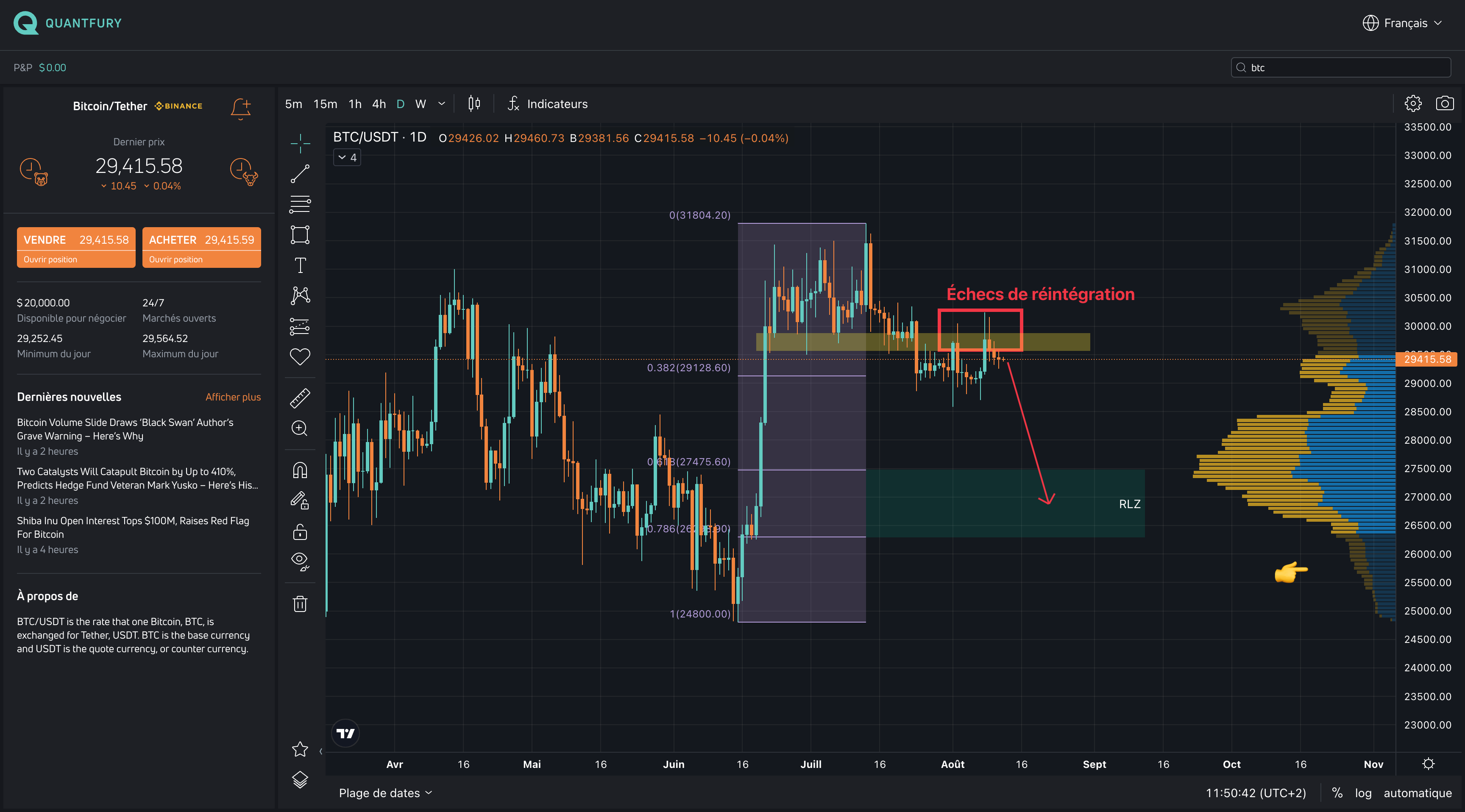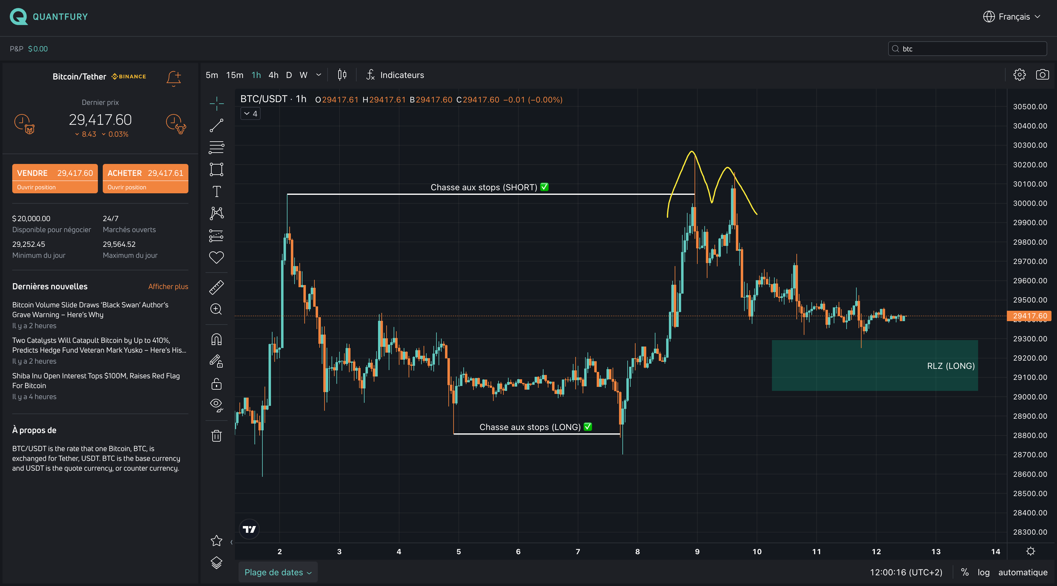 En horaire, le BTC est venu chasser les stops (SHORT) au-dessus de 30.000 $ avant de former un double top validĂ© qui confirme la tendance baissiĂšre mĂȘme Ă trĂšs court terme.