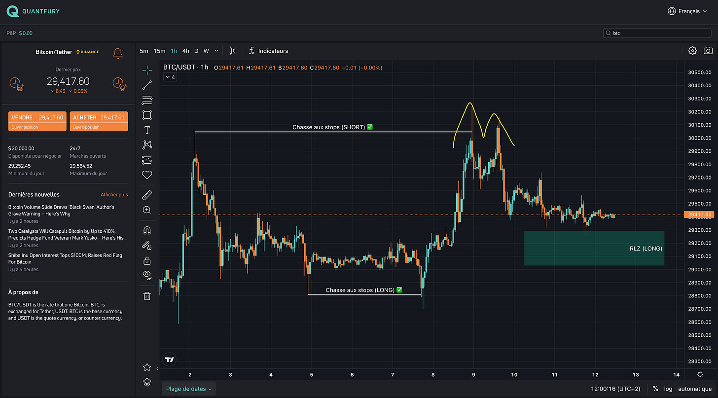 Si le prix en H1 forme une structure haussiĂšre dans la RLZ (LONG) entre 29.000 $ et 29.300 $, alors il deviendrait envisageable de nettoyer les stops (SHORT) au-dessus de 30.500 $.
