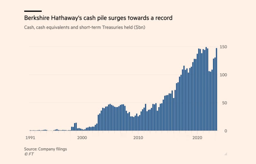 La trĂ©sorerie de Berkshire Hathaway (le fonds dâinvestissement de Warren Buffet) a presque atteint son plus haut niveau historique avec 147 milliards $ de liquiditĂ©s disponibles.