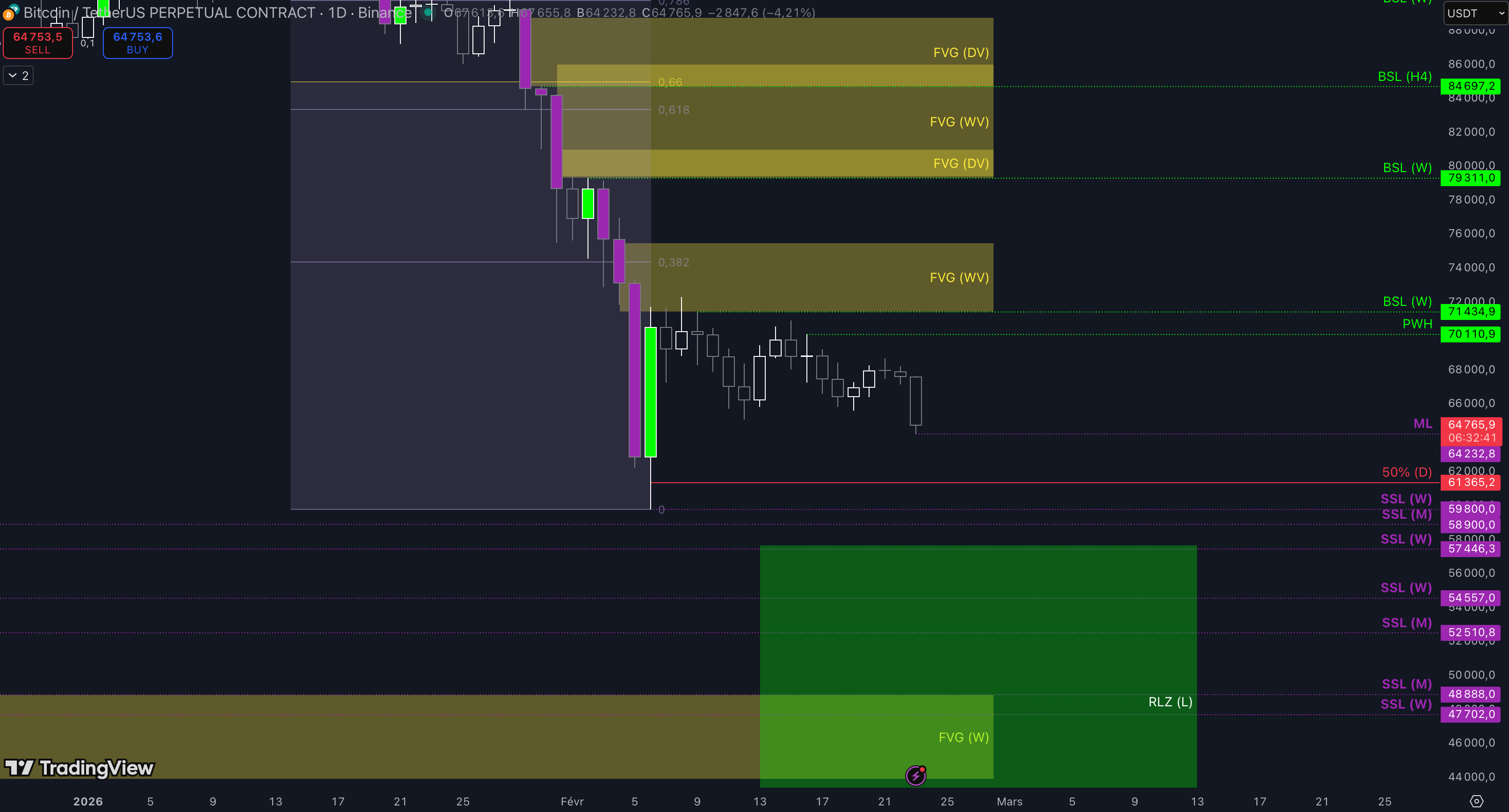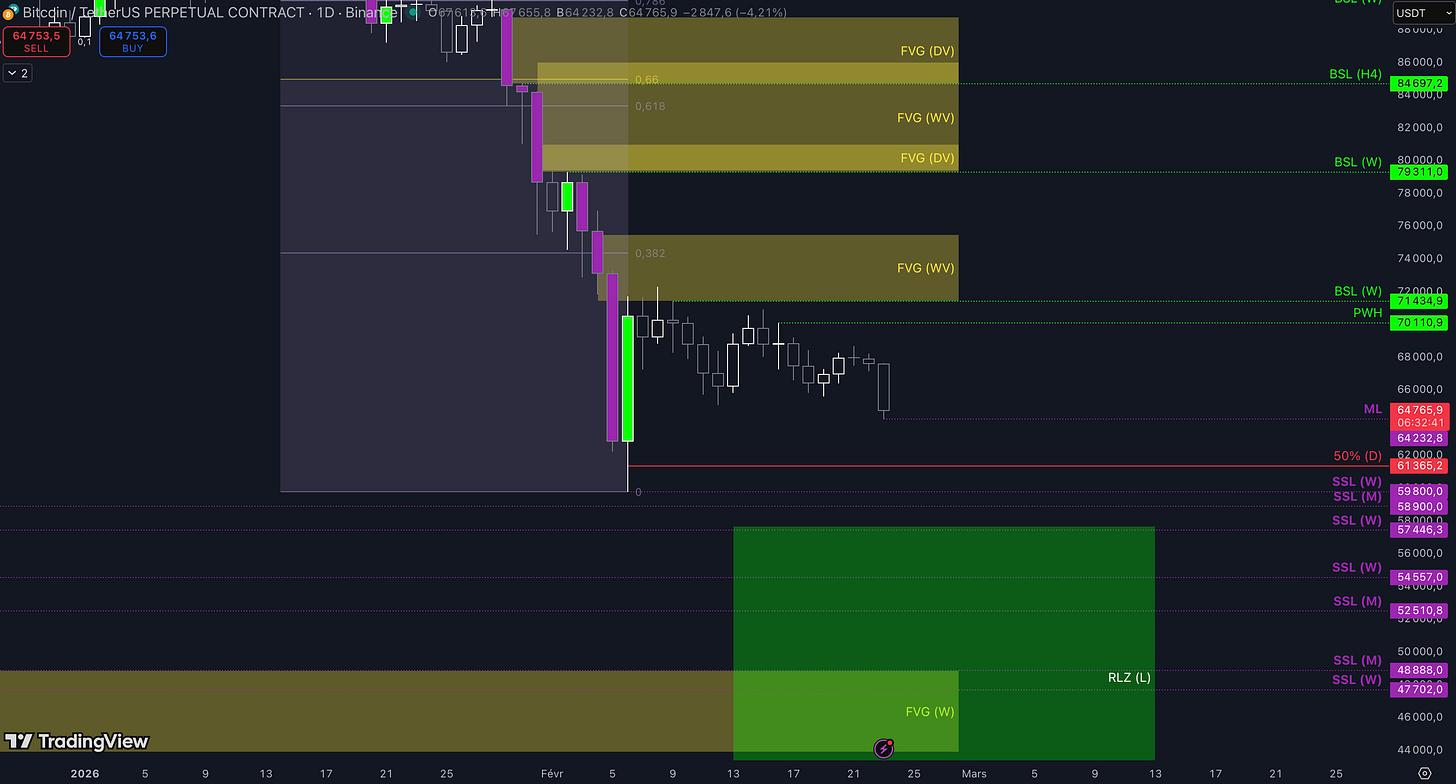 âTant que le niveau Ă 75.465 $ nâest pas cassĂ©, câest-Ă -dire quâaucune clĂŽture daily supĂ©rieure nâest validĂ©e, alors la dynamique restera baissiĂšre et les objectifs seront : le niveau Ă 65.081 $ (target N°1), puis, si aucun bottom ne se forme dans la zone prĂ©cĂ©dente, alors le prochain objectif sera le niveau Ă 61.365 $ (target N°2)â.