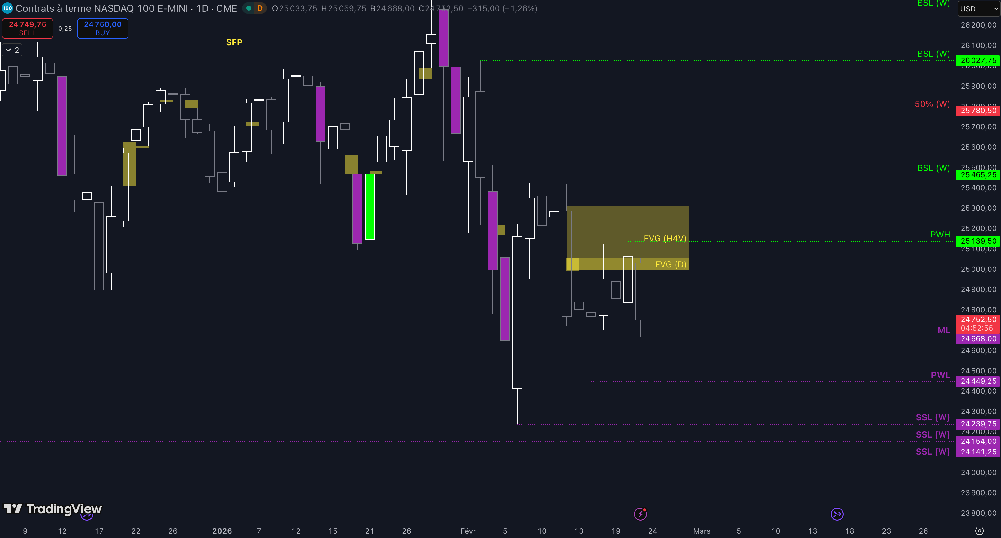 âTant que les 25.312 $ ne sont pas cassĂ©s, câest-Ă -dire quâaucune clĂŽture daily supĂ©rieure nâest validĂ©e, alors la dynamique restera baissiĂšre et les objectifs seront : le niveau Ă 24.578 $ (target N°1), puis, si aucun bottom ne se forme dans la zone prĂ©cĂ©dente, alors le prochain objectif sera le niveau Ă 24.239 $ (target N°2)â.