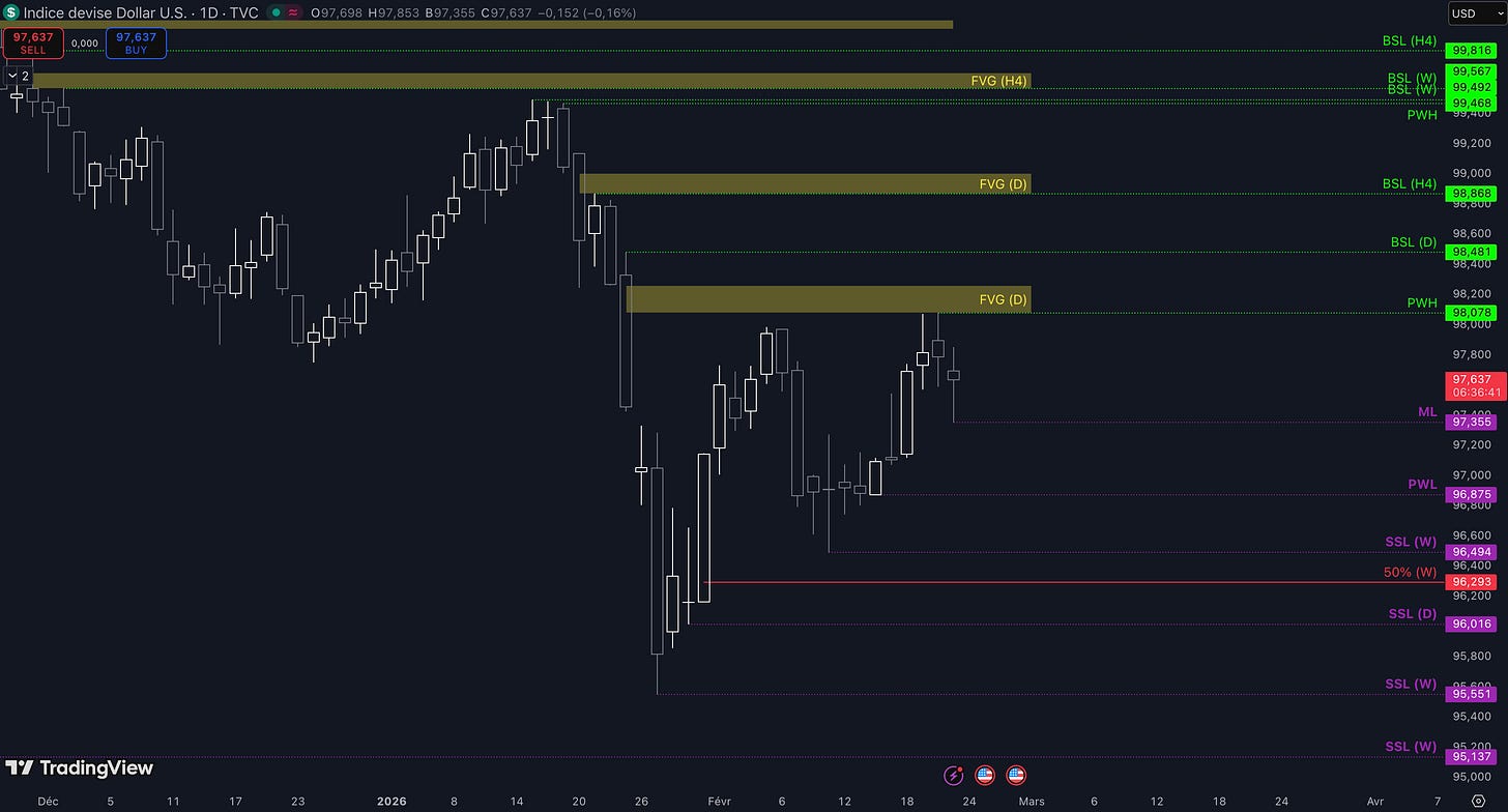 âTant que le niveau Ă 98,26 $ ne sera pas cassĂ©, câest-Ă -dire quâaucune clĂŽture daily supĂ©rieure nâest validĂ©e, alors la dynamique restera baissiĂšre et les objectifs seront : le niveau Ă 96,49 $ (target N°1), puis, si aucun bottom ne se forme dans la zone prĂ©cĂ©dente, alors le prochain objectif sera le niveau Ă 96,29 $ (target N°2)â.