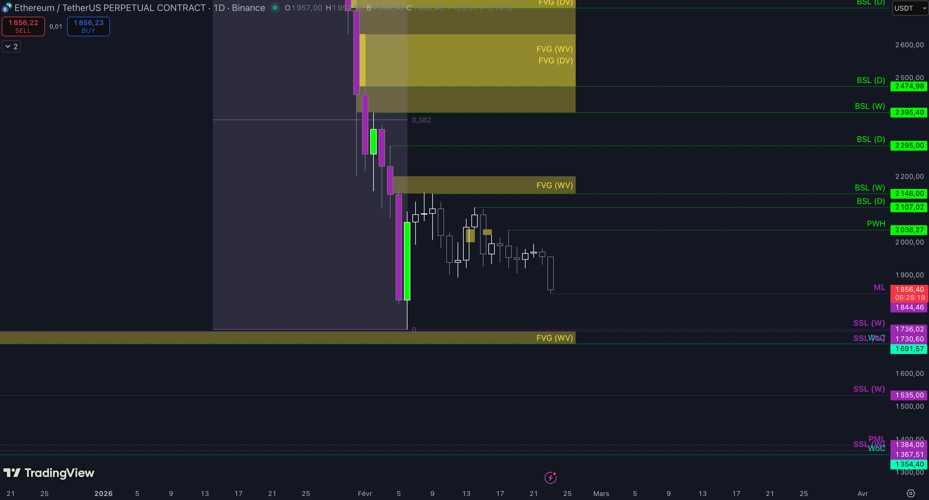 âTant que le niveau Ă 2.201 $ nâest pas cassĂ©, câest-Ă -dire quâaucune clĂŽture daily supĂ©rieure nâest validĂ©e, alors la dynamique restera baissiĂšre et les objectifs seront : le niveau Ă 1.893 $ (target N°1), puis, si aucun bottom ne se forme dans la zone prĂ©cĂ©dente, alors le prochain objectif sera le niveau Ă 1.736 $ (target N°2)â.