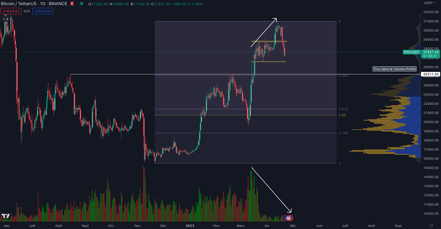 Le support des 25.000 $ nâa encore jamais Ă©tĂ© retestĂ© alors quâil sâagit dâun niveau de confluence Ă©norme : le premier arrĂȘt des 0,382 de Fibonacci, le trou colossal dans le volume profile entre 25.200 $ et 26.500 $ qui demeure une zone dâimbalance importante qui sera comblĂ©e tĂŽt au tard.