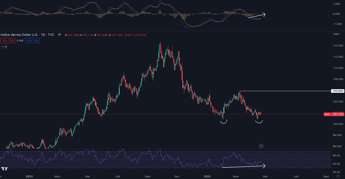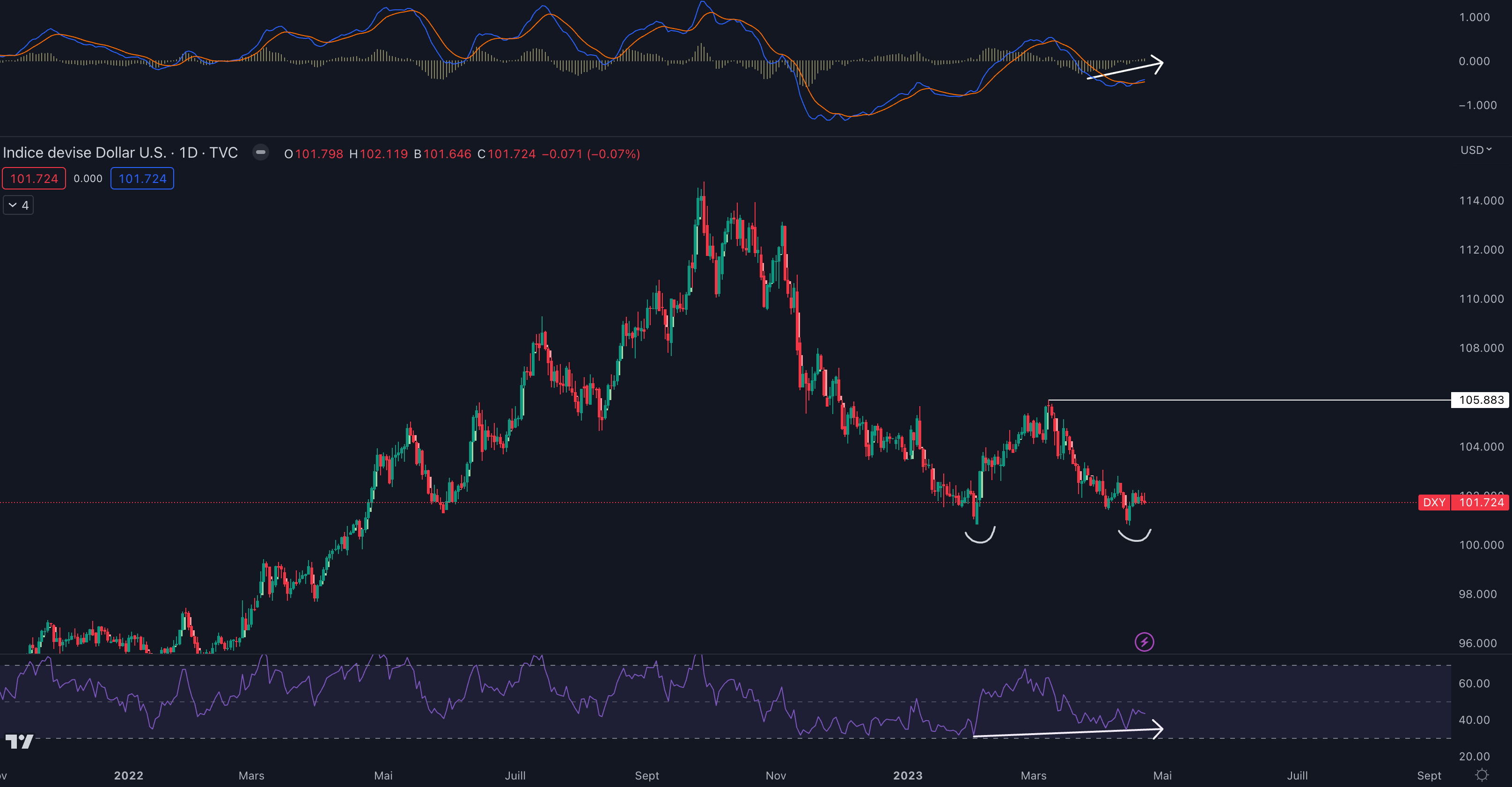 Le DXY imprime deux points bas Ă©quivalents et montre des divergences haussiĂšres provenant du RSI et du MACD donc un retournement haussier potentiel se prĂ©pare (aucun rebond nâapparaĂźt pour autant). La relation entre le DXY et les actifs Ă risque est inversement proportionnelle, donc si le DXY grimpe alors les indices boursiers et les cryptomonnaies baisseront.