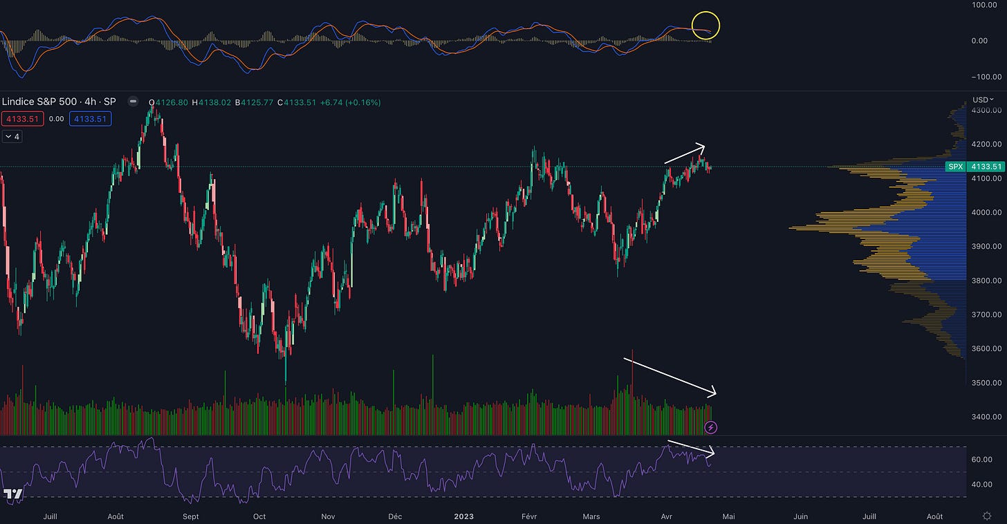 Le S&P 500 dessine Ă lâinverse une divergence baissiĂšre et demeure sous une rĂ©sistance quâil ne parvient pour lâinstant pas Ă casser. La structure actuelle du prix (point haut plus bas que le prĂ©cĂ©dent) et la faiblesse du momentum traduit Ă©galement une potentielle baisse.
