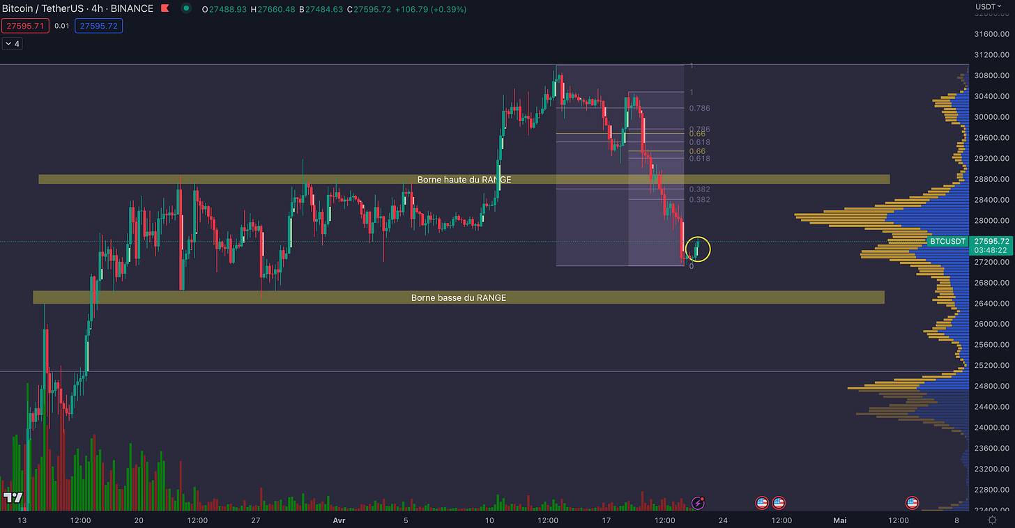 Avant dâatteindre les 26.500 $ (si lâon y vient pour nettoyer les ordres stop des LONG), il est probable dâavoir un rebond sur le BTC autour du 0,382 de Fibonacci soit entre 28.400 $ et 28.600 $.
